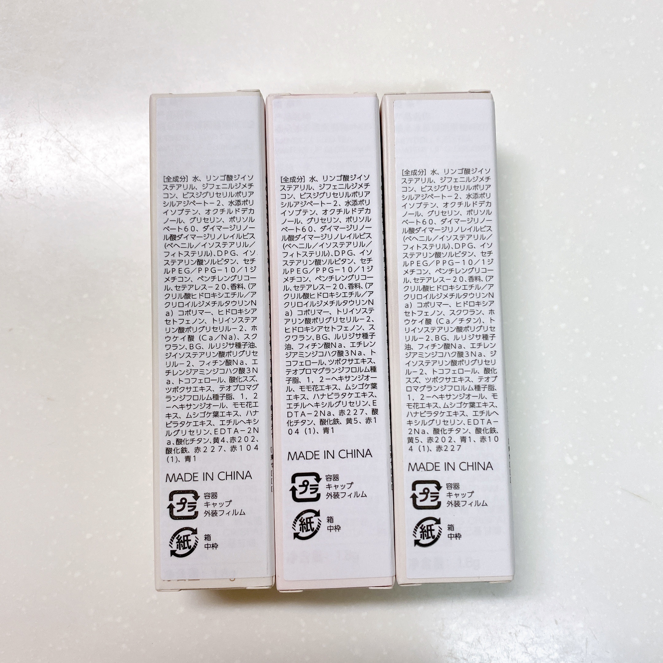 - <N01 白桃練乳茶> 水、リンゴ酸ジイソ ステアリル、ジフェニルジメチ コン、ビスジグリセリルポリア シルアジペート-2、水添ポリ イソブテン、オクチルドデカ ノール、グリセリン、ポリソル ベート60、ダイマージリノー ル酸ダイマージリノレイルビス (ベヘニル/イソステアリル/ フィトステリル)、DPG、イソ ステアリン酸ソルビタン、セチ ルPEG/PPG-10/1ジ メチコン、ペンチレングリコー ル、セテアレス-20、香料、(ア クリル酸ヒドロキシエチル/ア クリロイルジメチルタウリンN a)コポリマー、ヒドロキシア セトフェノン、スクワラン、B G、ルリジサ種子油、トリイソ ステアリン酸ポリグリセリル- 2、フィチン酸Na、ジイソス テアリン酸ポリグリセリル- 2、エチレンジアミンジコハク 酸3Na、トコフェロール、ツ ボクサエキス、テオブロマグラ ンジフロルム種子脂、1,2- ヘキサンジオール、モモ花エキ ス、ムシゴケ葉エキス、ハナビ ラタケエキス、エチルへキシル グリセリン、EDTA-2Na、酸化チタン、赤202、酸化鉄、黄5、赤227、青1 <N03 グァバピーチ茶> 水、リンゴ酸ジイソステアリル、ジフェニルジメチコン、ビスジグリセリルポリアシルアジペート-2、水添ポリイソブテン、オクチルドデカノール、グリセリン、ポリソルベート60、ダイマージリノール酸ダイマージリノレイルビス(ベヘニル/イソステアリル/フィトステリル)、DPG、イソステアリン酸ソルビタン、セチルPEG/PPG-10/1ジメチコン、ペンチレングリコール、セテアレス-20、香料、(アクリル酸ヒドロキシエチル/アクリロイルジメチルタウリンNa)コポリマー、ヒドロキシアセトフェノン、スクワラン、トリイソステアリン酸ポリグリセリル-2、BG、ルリジサ種子油、ツボクサエキス、テオブロマグランジフロルム種子脂、モモ花エキス、ムシゴケ葉エキス、ハナビラタケエキス、フィチン酸Na、エチレンジアミンジコハク酸3Na、ジイソステアリン酸ポリグリセリル-2、トコフェロール、1,2-ヘキサンジオール、エチルヘキシルグリセリン、EDTA-2Na、酸化鉄、酸化チタン、赤227、赤202、黄5、青1 <V04 桜ルイボス茶> 水、リンゴ酸ジイソステアリル、ジフェニルジメチコン、ビスジグリセリルポリアシルアジペート-2、水添ポリイソブテン、オクチルドデカノール、グリセリン、ポリソルベート60、ダイマージリノール酸ダイマージリノレイルビス(ベヘニル/イソステアリル/フィトステリル)、DPG、イソステアリン酸ソルビタン、セチルPEG/PPG-10/1ジメチコン、ペンチレングリコール、セテアレス-20、香料、ホウケイ酸(Ca/Al)、(アクリル酸ヒドロキシエチル/アクリロイルジメチルタウリンNa)コポリマー、ヒドロキシアセトフェノン、スクワラン、トリイソステアリン酸ポリグリセリル-2、BG、ルリジサ種子油、ジイソステアリン酸ポリグリセリル-2、フィチン酸Na、エチレンジアミンジコハク酸3Na、酸化スズ、トコフェロール、ツボクサエキス、テオブロマグランジフロルム種子脂、1,2-ヘキサンジオール、モモ花エキス、ムシゴケ葉エキス、ハナビラタケエキス、エチルへキシルグリセリン、EDTA-2Na、酸化チタン、黄4、赤227、赤202、酸化鉄、赤104(1)、青1 <N05 無花果ゼリー茶> 水、リンゴ酸ジイソ ステアリル、ジフェニルジメチ コン、ビスジグリセリルポリア シルアジペート-2、水添ポリ イソブテン、オクチルドデカ ノール、グリセリン、ポリソル ベート60、ダイマージリノー ル酸ダイマージリノレイルビス (ベヘニル/イソステアリル/ フィトステリル)、DPG、イソ ステアリン酸ソルビタン、セチ ルPEG/PPG-10/1ジ メチコン、ペンチレングリコー ル、セテアレス-20、香料、(ア クリル酸ヒドロキシエチル/ア クリロイルジメチルタウリンN a)コポリマー、トリイソステ アリン酸ポリグリセリル-2、ヒドロキシアセトフェノン、ス クワラン、BG、ルリジサ種子 油、フィチン酸Na、エチレン ジアミンジコハク酸3Na、ト コフェロール、ツボクサエキス、テオブロマグランジフロルム種 子脂、1,2-ヘキサンジオー ル、モモ花エキス、ムシゴケ葉 エキス、ハナビラタケエキス、エチルへキシルグリセリン、E DTA-2Na、赤227、酸 化チタン、酸化鉄、黄5、赤1 04(1)、青1 <N06 ライチソーダ茶> 水、リンゴ酸ジイソ ステアリル、ジフェニルジメチ コン、ビスジグリセリルポリア シルアジペート-2、水添ポリ イソブテン、オクチルドデカ ノール、グリセリン、ポリソル ベート60、ダイマージリノー ル酸ダイマージリノレイルビス (ベヘニル/イソステアリル/ フィトステリル)、DPG、イソ ステアリン酸ソルビタン、セチ ルPEG/PPG-10/1ジ メチコン、ペンチレングリコー ル、セテアレス-20、香料、(ア クリル酸ヒドロキシエチル/ア クリロイルジメチルタウリンN a)コポリマー、ヒドロキシア セトフェノン、スクワラン、B G、トリイソステアリン酸ポリ グリセリル-2、ルリジサ種子 油、ジイソステアリン酸ポリグ リセリル-2、フィチン酸Na、エチレンジアミンジコハク酸3 Na、トコフェロール、ツボク サエキス、テオブロマグランジ フロルム
