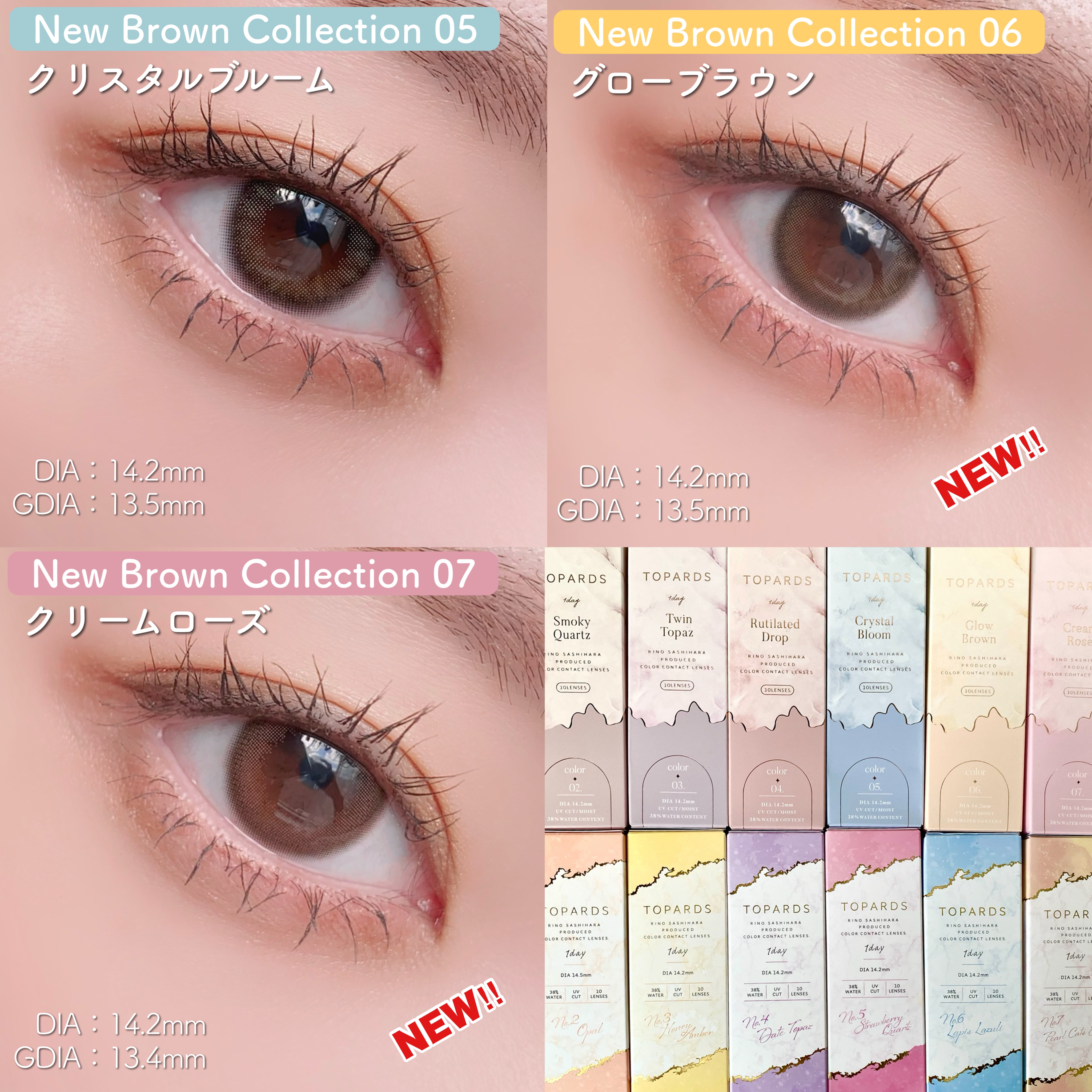 グレージュクォーツ、スモーキークォーツ、クリスタルブルームが気になります! 黒目が少し暗めのこげ茶なのですが、上記の色味だと少し明るくなる程度でしょうか…?