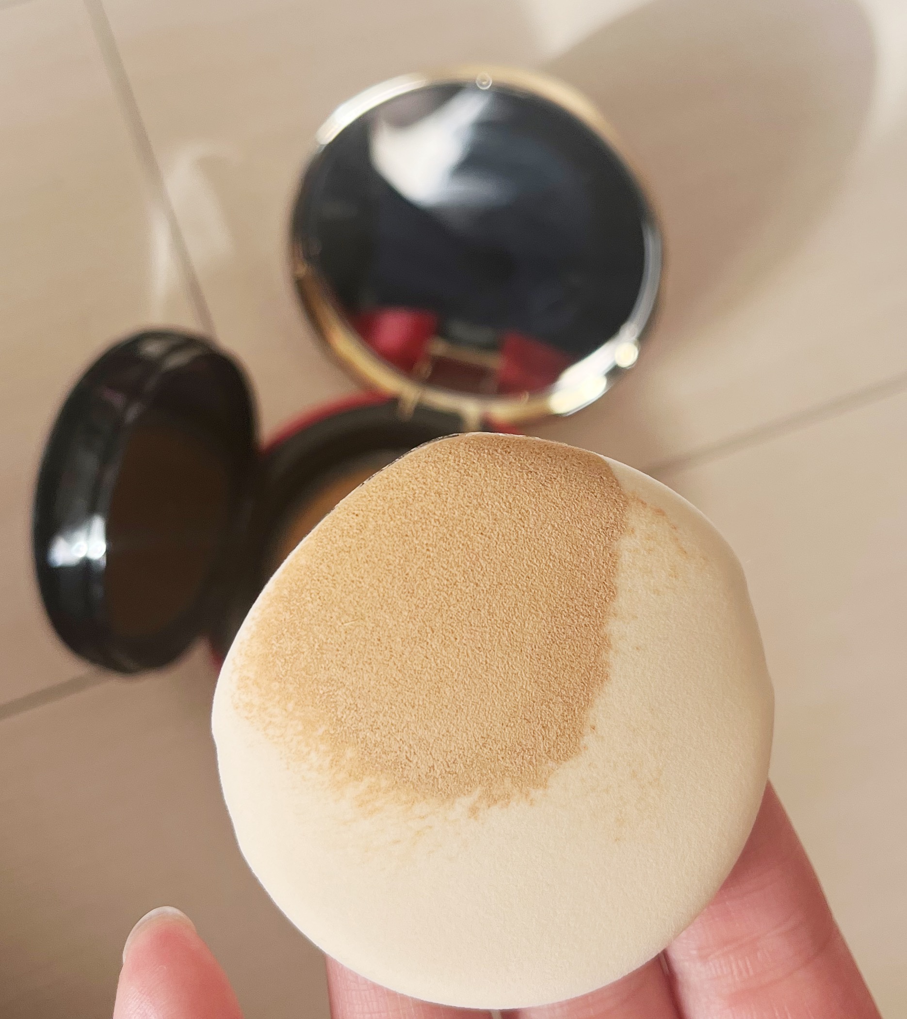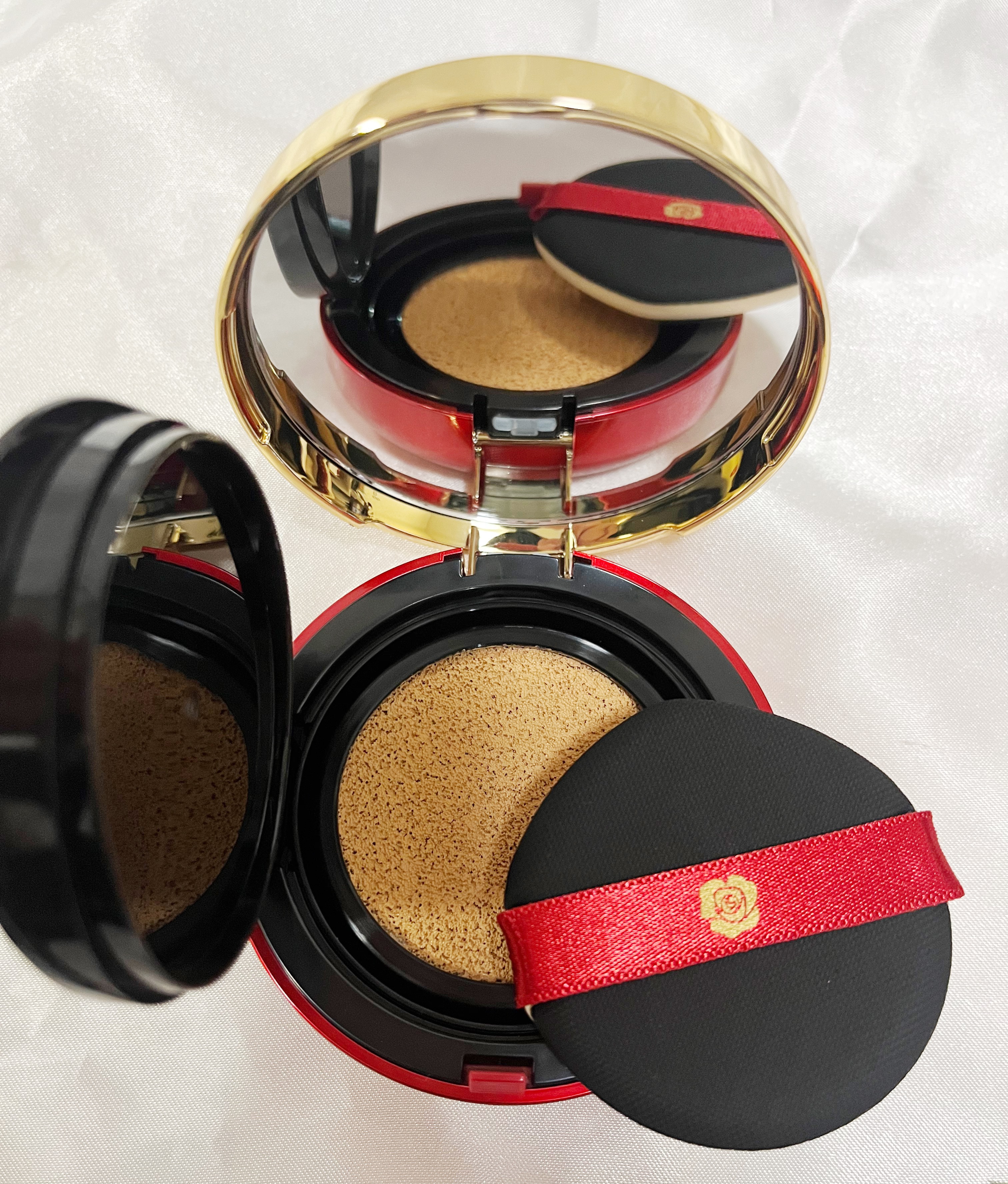 簡単にベースメイクが楽しめる クッションファンデーション。詰替用使ってリピート中。 赤×ゴールドの華やかなケース。1つで #美容液 #日焼け止め (SPF50+ / PA++++) #化粧下地 #ファンデーション #コンシーラー #ハイライト の6役を果たしてくれるの。 パフがドロップ型で小鼻とか細かいところが塗りやすいのが何気に嬉しい☺︎
