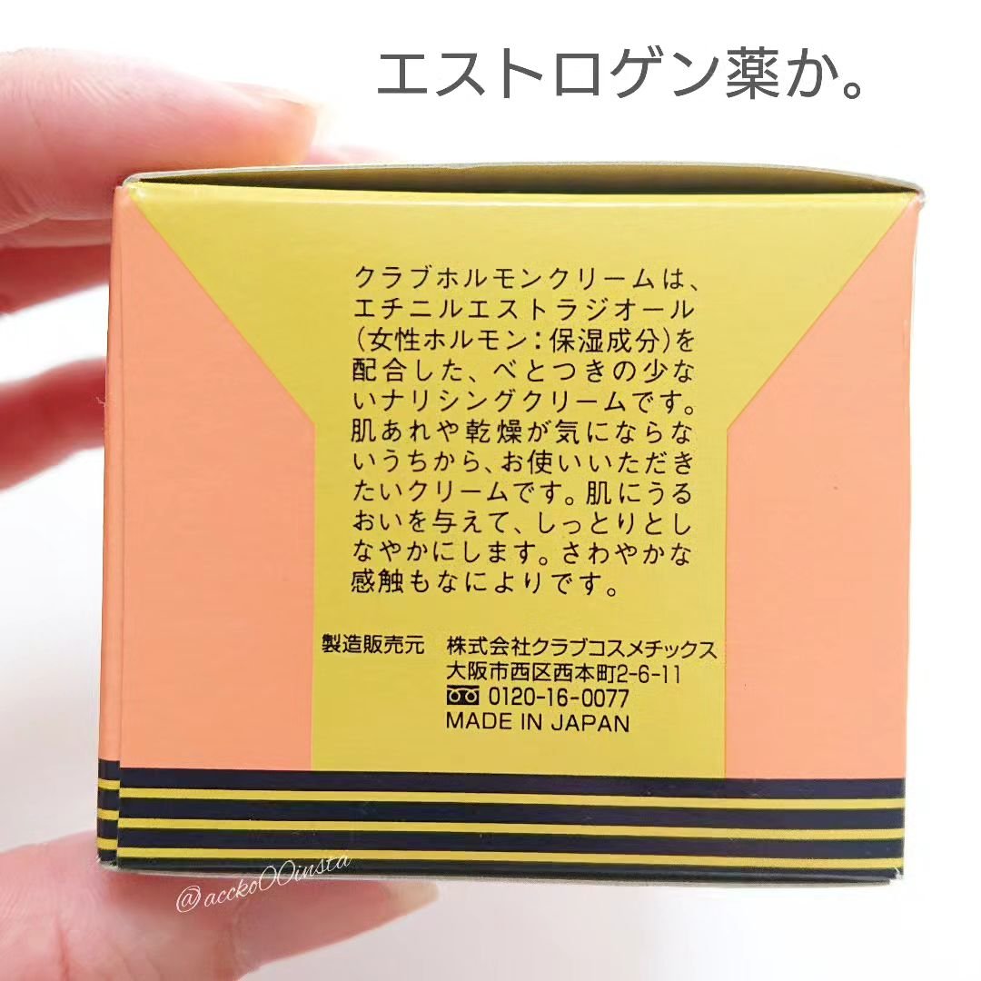 クラブホルモンクリーム微香料ほのかなローズの香りらしいです。普通のクリームの匂いしかしなかったけど…口コミで気になって薬局回り続けて、やっと見つけました!テクスチャは固めだけど、伸びます✨つけた後はしっとりします。ベタつきはあまり気にならない...