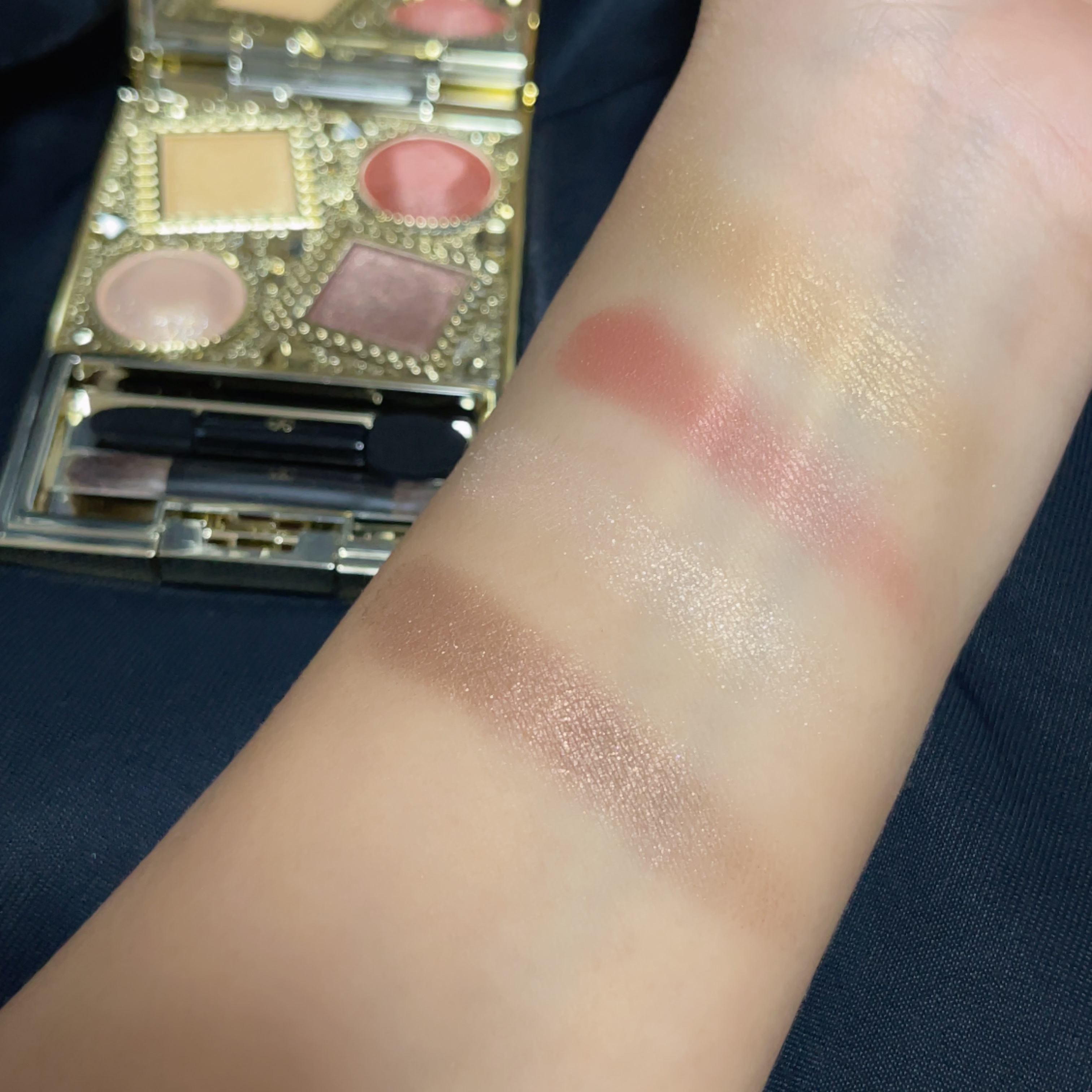 エレガンスの今年のクリスマスコフレ🎄 全体的に暖かみのあるカラーで統一されていて、多幸感のあるメイクを楽しむことができます♡ ゴールドラメが煌めくアイパレット。深みのあるバーガンディカラーがピリッと効いたブラウン系のパレットです。 もっちりとした仕上がりで、お肌の乾燥が気にならないところに感動!