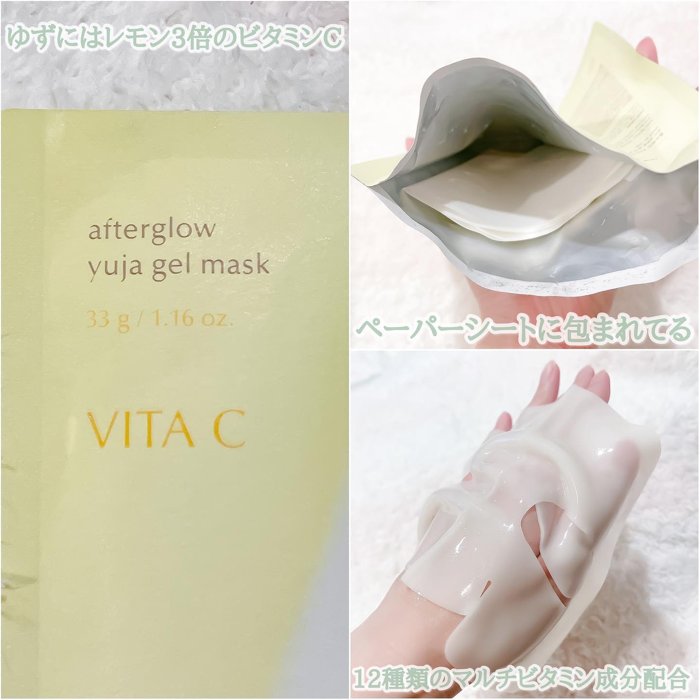 - エッセンスをたっぷり含んだゲル状マスク。 肌にしっかりと密着し、時間が経ってもしっとり感を保つことができます。 ゆずエキス配合で、豊富なビタミンCが透明感のある水光肌へと導きます。