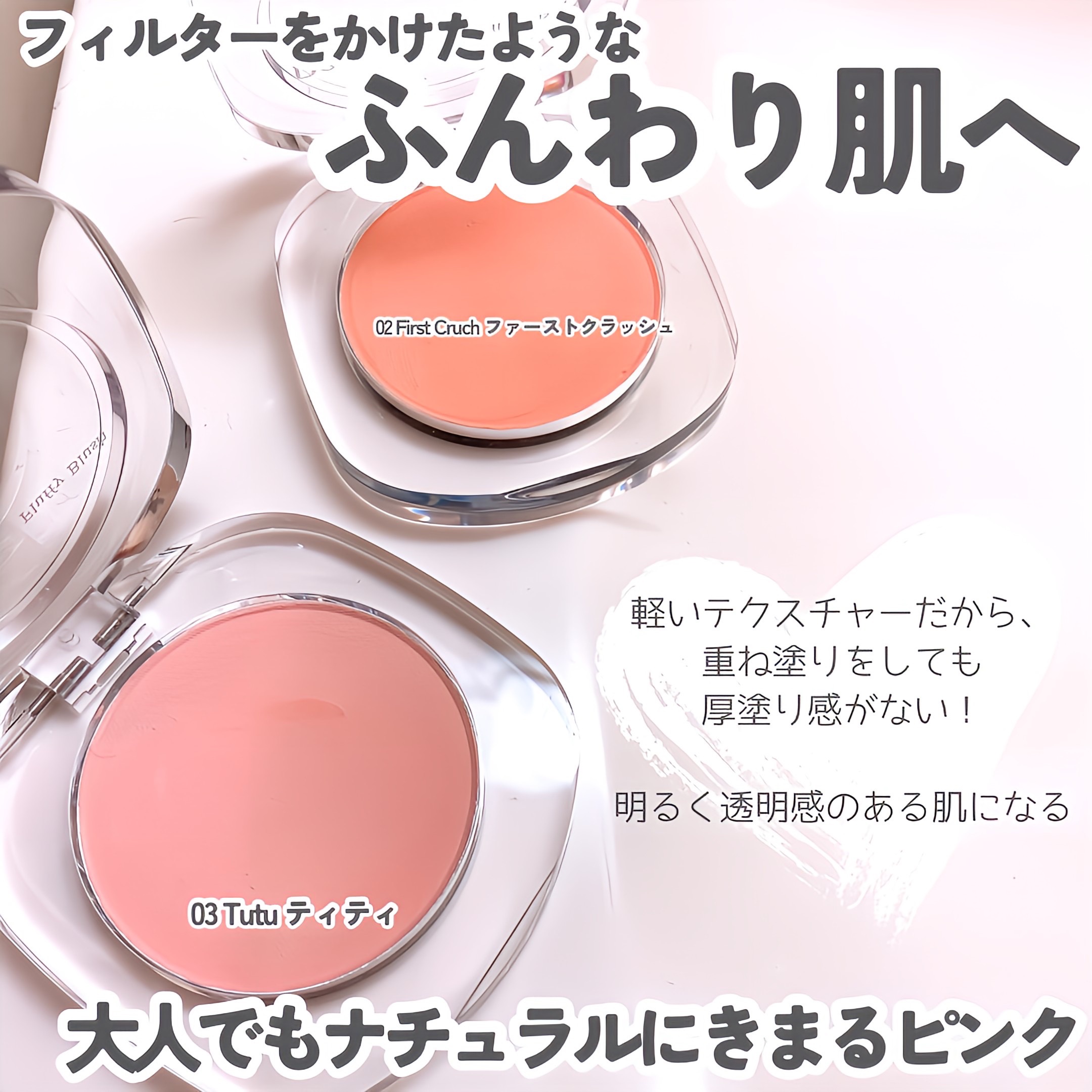白みのあるピンク色で、ふんわり発色🫧 可愛らしさと大人らしさを兼ね備えたピンクチークです💖 カラーが淡く、薄づきで顔の余白を埋めてくれるからいつもより小顔に見える🫧 粉質も柔らかく重ね塗りしても厚塗り感が出ないふわふわのほっぺたに!
