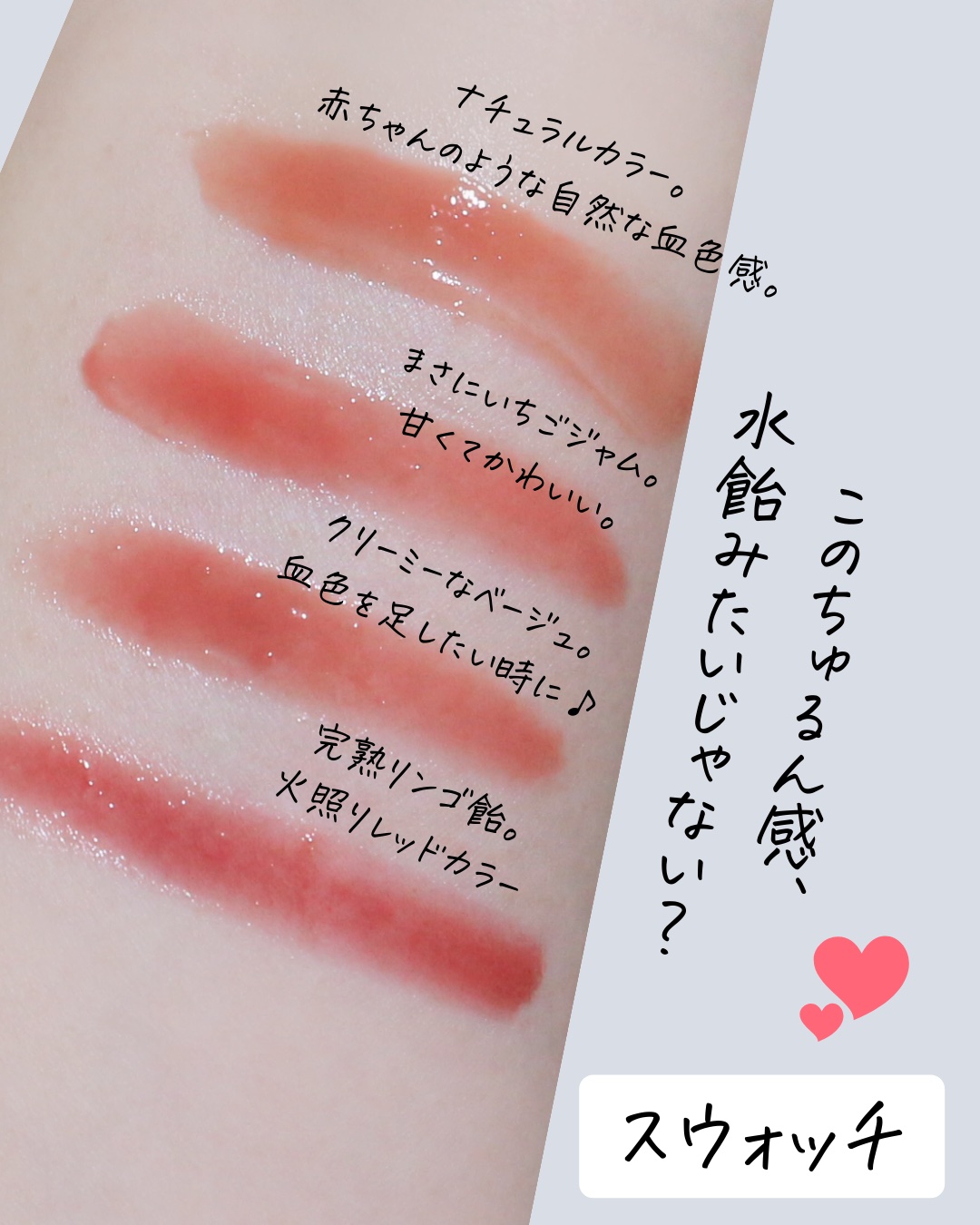 - 保湿成分たっぷりで、うるうるのぽってり唇*1を長時間演出。 透け感×馴染みのいいカラーで、いつものリップに潤いとあざとさをプラス! ノールックで塗り直しできるので、学校やお仕事の日にもオススメ。 01 ももドロップ ももドロップはドロップのような透け感と低彩度のももピンクで一番*2ナチュラルなカラー。 赤ちゃんのように自然な血色感で、白湯メイクにオススメ。 02 いちごジャム いちごジャムはジャムのようなぷるぷる感と、キュートな少女ピンクの定番カラー。 甘くてカワイイ雰囲気をまといたい日や、純欲メイクにオススメ。 03 みるくウーロン みるくウーロンはクリーミーなベージュウーロンカラーで一番*2なじみのいい粘膜つやカラー。 ちょっと血色を足したいすっぴんメイクや、スクールメイク、お仕事メイクにオススメ。 04 りんごアメ りんごアメは完熟りんごアメのようなちゅるちゅる火照りレッドカラー。 ぽってりリップで色気を出したい日や、ベースリップの発色が物足りない時にも。 *1メイク効果 *2ブランド内において