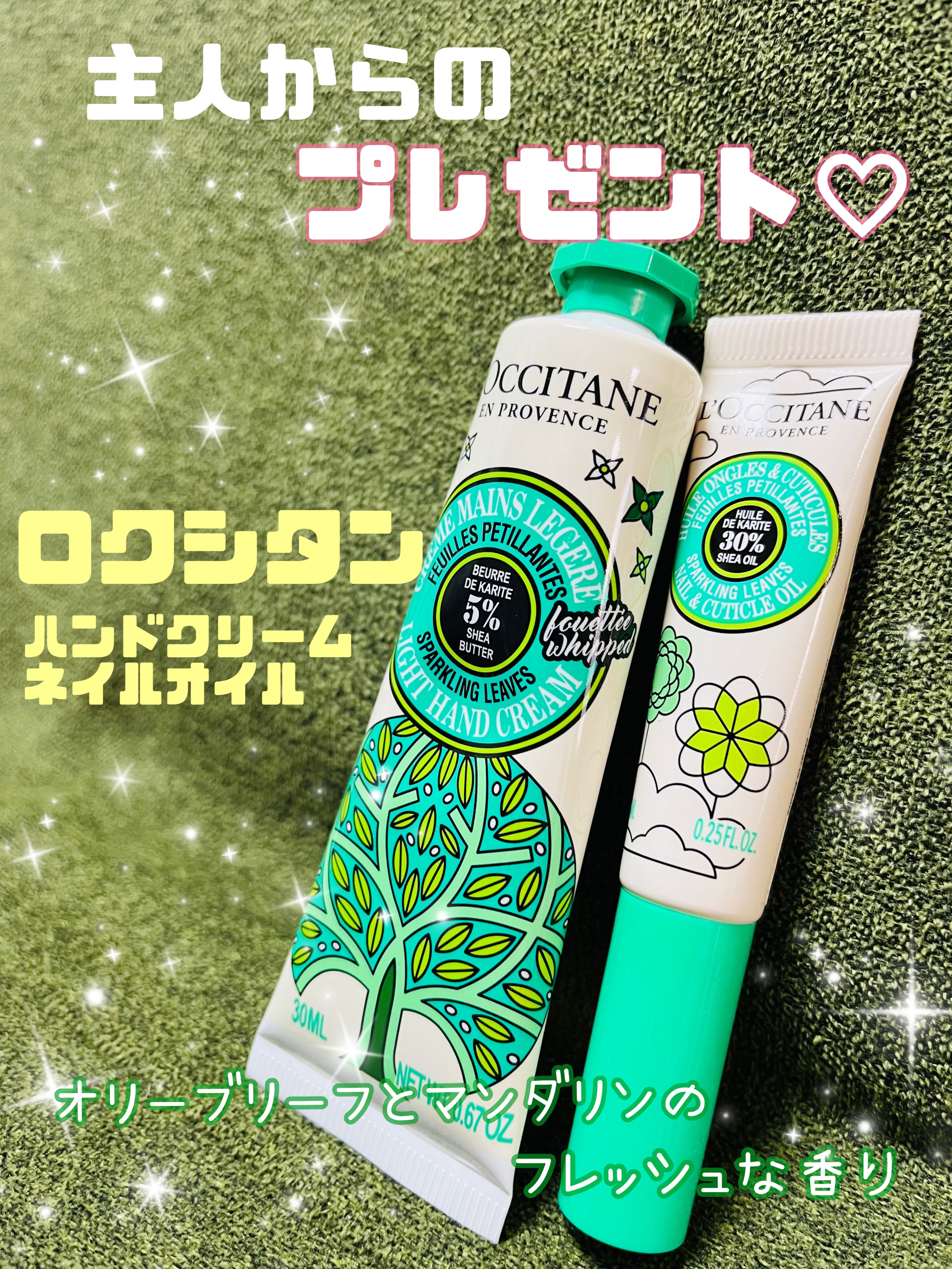 ロクシタンスパークリングリーフシアハグ&キス..𖥧𖥧𖧧˒˒..𖡼.𖤣𖥧⠜..𖥧𖥧𖧧˒˒..𖡼.𖤣𖥧嬉しいプレゼント🎁ハンドクリームとリップ。名前がステキ💋オリーブの葉とマンダリンの香りなんだって。いい香り🌱パッケージが可愛いくてツリーのオーナ...