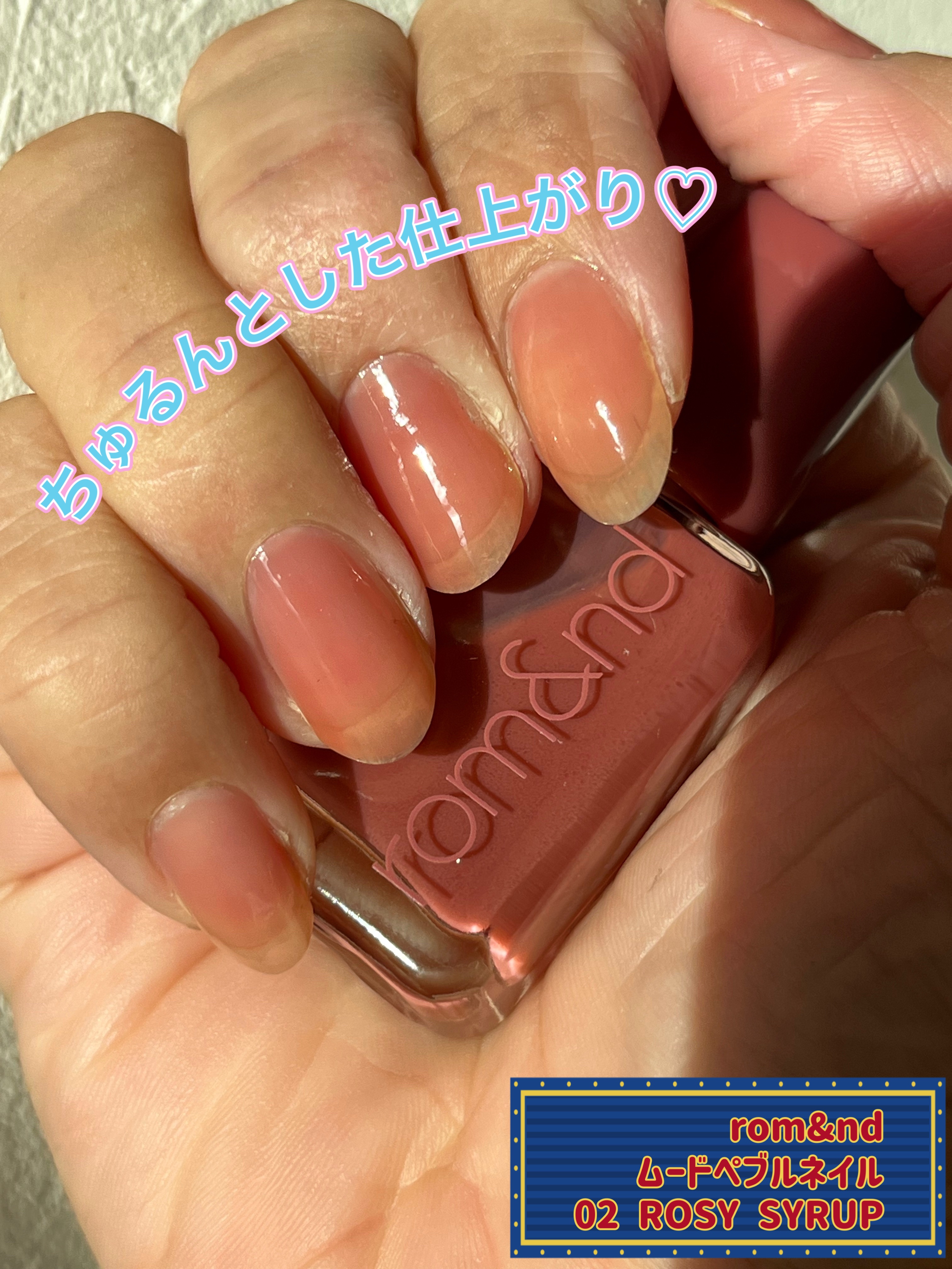 - 指先に玉石のような、ならかな光沢をとどめる。塗った瞬間から綺麗なツヤと光沢を維持し、重ねて塗っても透き通ったカラー感を鮮やかにとどめる、素早い乾燥力のナチュラルカラーネイル。「ロムアンド」の次世代型ネイルです。