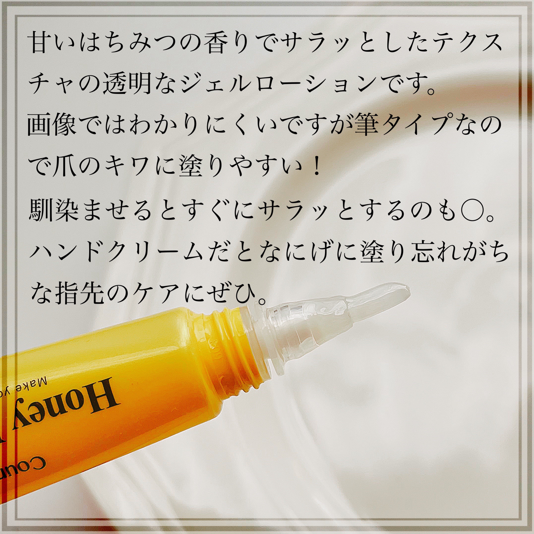 - 美しい爪のためのハチミツ(保湿成分)のネイルオイル ●ハチミツやオーガニックオイルなどの保湿美容成分を配合したネイルオイルです。 ●ジェルオイルなので液だれしにくく、どこでも気になった時にケアできます。 ●使いやすい筆タイプ。