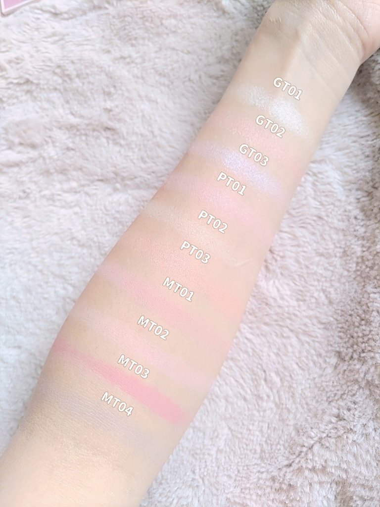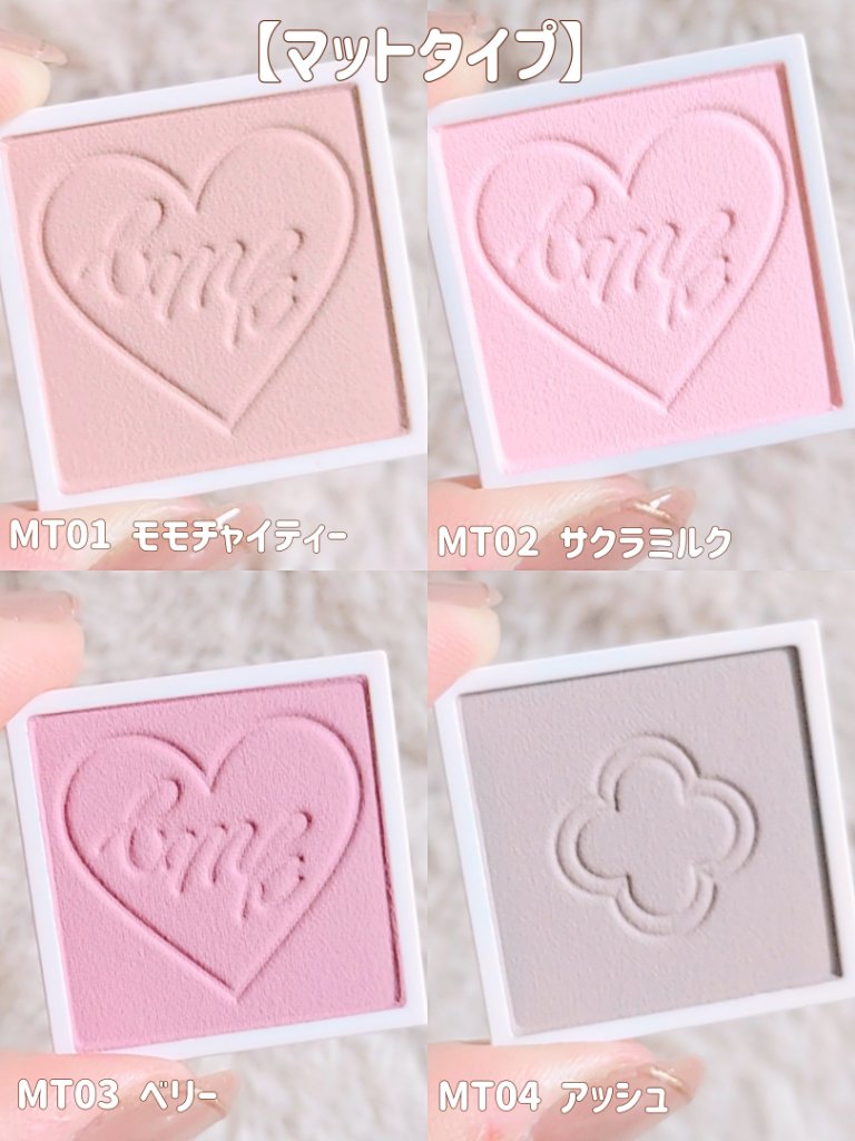 もう見た瞬間ハートの可愛さにめちゃときめいた これはもうベスコスですね! 全体的なバランスも良くてマット、ラメ、パールと一通りそろってます チークも白みのあるオレンジカラーとピーチカラー ハートの部分は白っぽいカラーとピンクっぽいカラー ピンクは結構カラーがでるのでノーズには向かないかな、頬のハイライト兼チークとしてがおすすめ