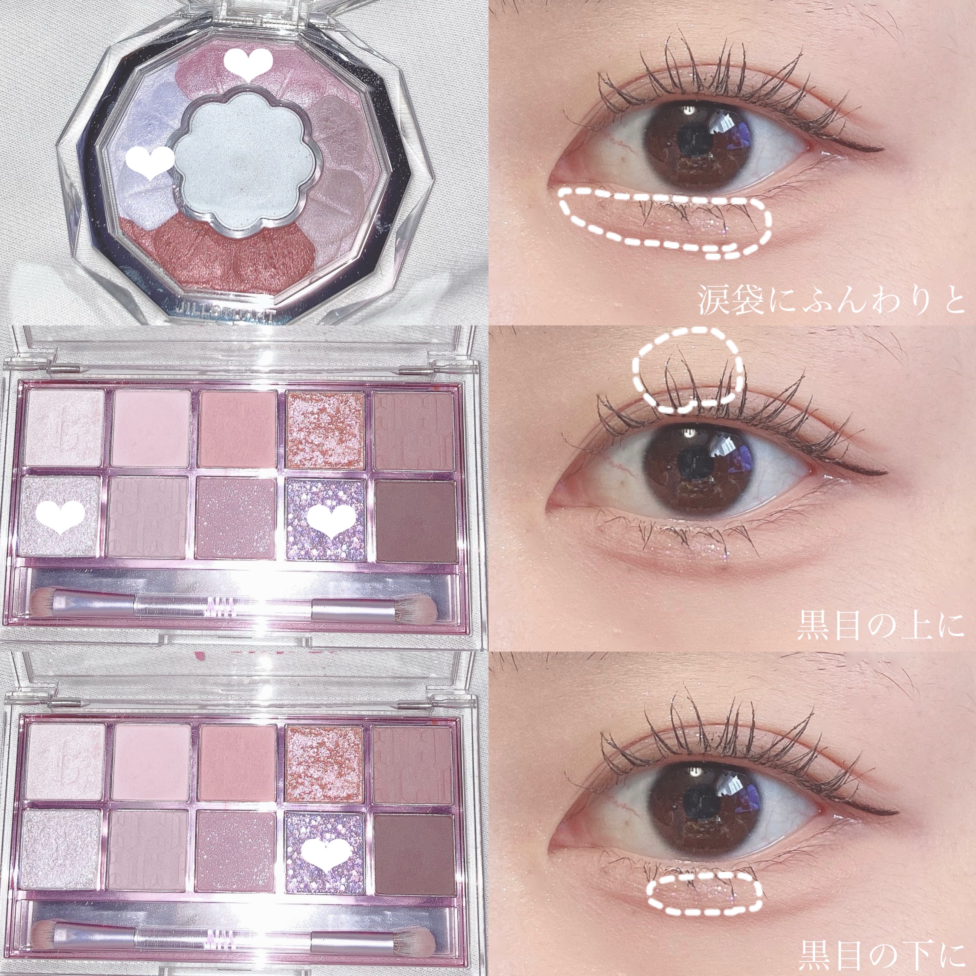 今回はキラキラで盛りつつふんわりとした印象にしたかったので以下のことを意識しました! ・ふんわりとした印象にするために締め色はメインカラーと混ぜて使う ・アイシャドウは塗りすぎ注意!少しはたいてから塗ると濃くなりにくいです ・涙袋はぷっくりに見せるために最初に締め色とメインカラーを混ぜて涙袋の影を下書きとして軽く描いておく ・ウルウルな目にしたかったので黒目の下のまつ毛の隙間にグリッターを軽く塗る ・アイラインはペンシルタイプでプラム系カラーを使い、メインカラーと締め色を混ぜアイラインをボカすとフワッとした印象になる