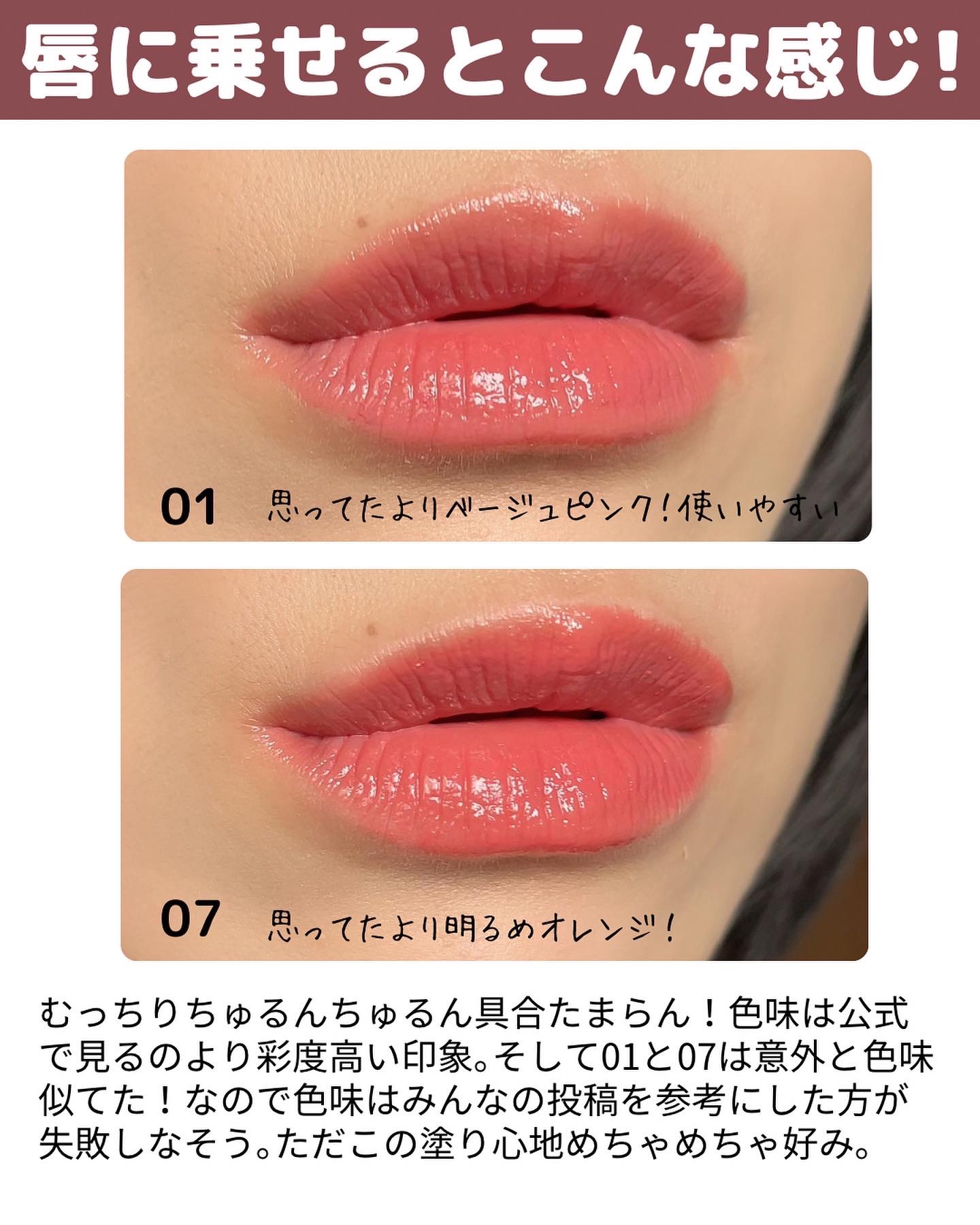発色はけっこうよくて一度塗りでもしっかり色づく。 色持ちはティントじゃないからそこまでよくはないかな。 ツヤ感、透明感ありでどんなメイクの時にも使いやすい。 唇の血色悪い人はこの透明感で思ってたより発色しないかもしれない。 唇の血色いい人はヴィセの方が合ってそう。