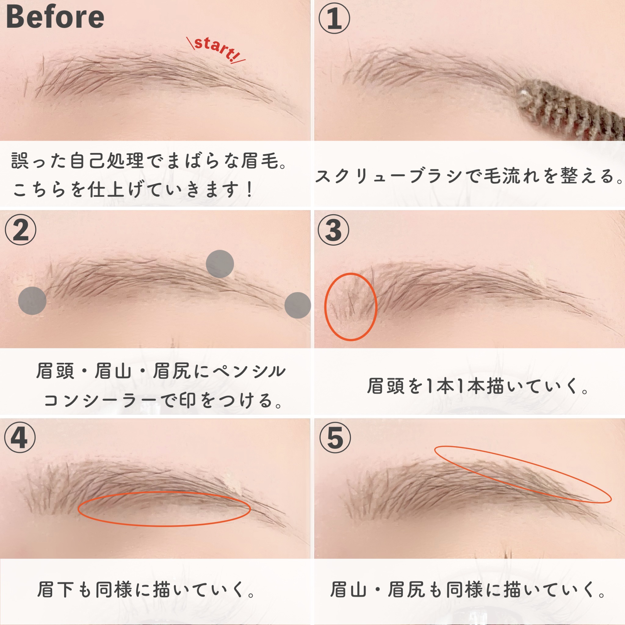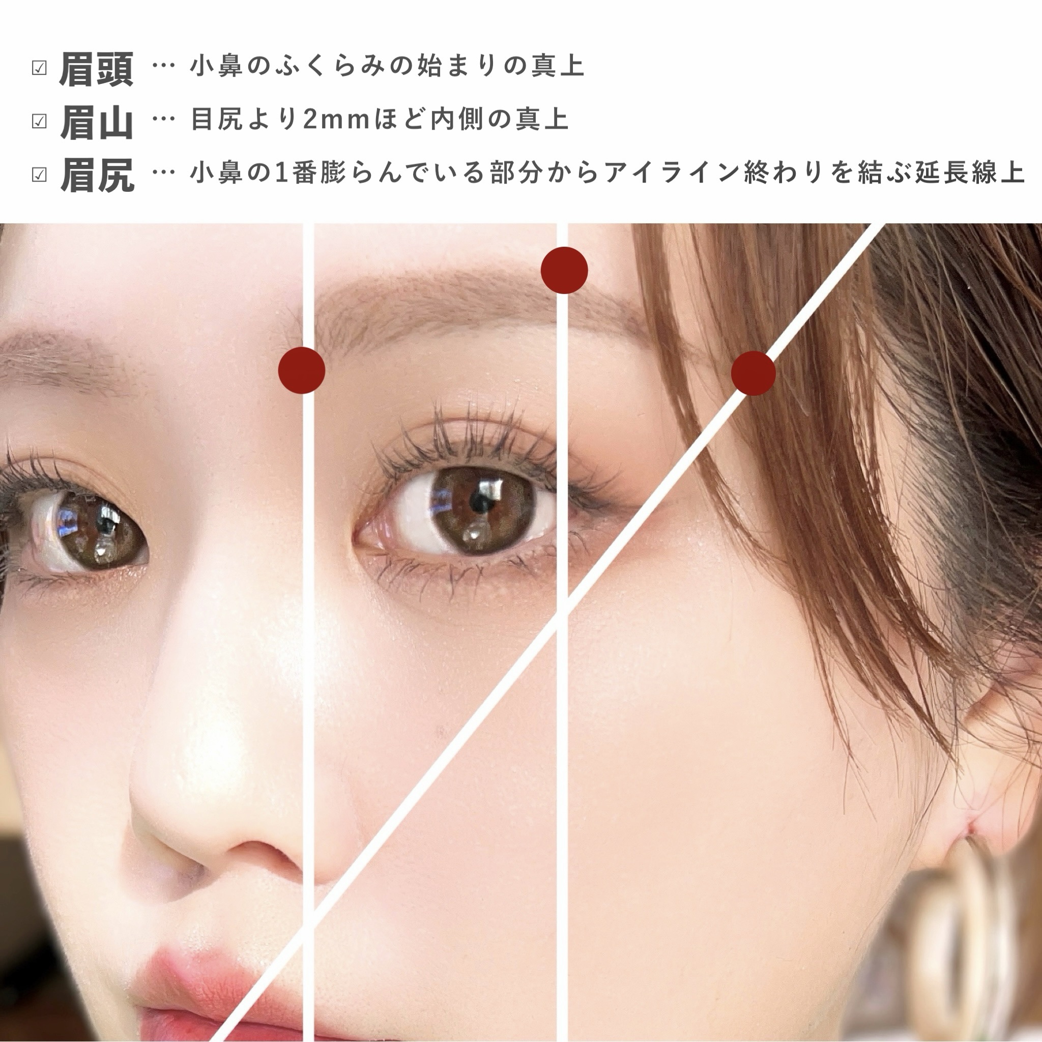 眉の理想位置👑 眉頭…目頭から垂直に上に伸ばしたところ 眉山…小鼻と瞳の中央を繋いだ延長線上 眉尻…小鼻と目尻を繋いだ延長線上 目安だよ!好みに合わせて変えるのもあり🙆♀️ メイク手順 ①眉毛の下側を描く ②眉山の位置を決める ③眉尻まで線をひく ④パウダーでうめる ⑤眉マスカラを塗る ポイント🌷 くっきり描きすぎた場合はスクリューブラシで優しくぼかすと自然に仕上がるよ🧚🏻♀️ 眉尻の周りをパウダータイプのハイライトで囲むと綺麗な眉にみえる!
