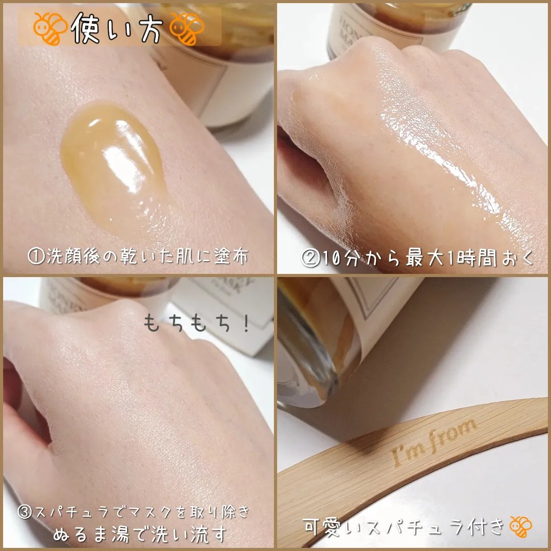 開封してすぐハチミツの香り♪癒しでしかないw そんなお高いパックではなかったので、乾燥肌よりの混合肌の私には潤いが足りなかったけど夏ならちょうど良い◯ 香りが癒されるからもう少し購入しとけば良かったな…