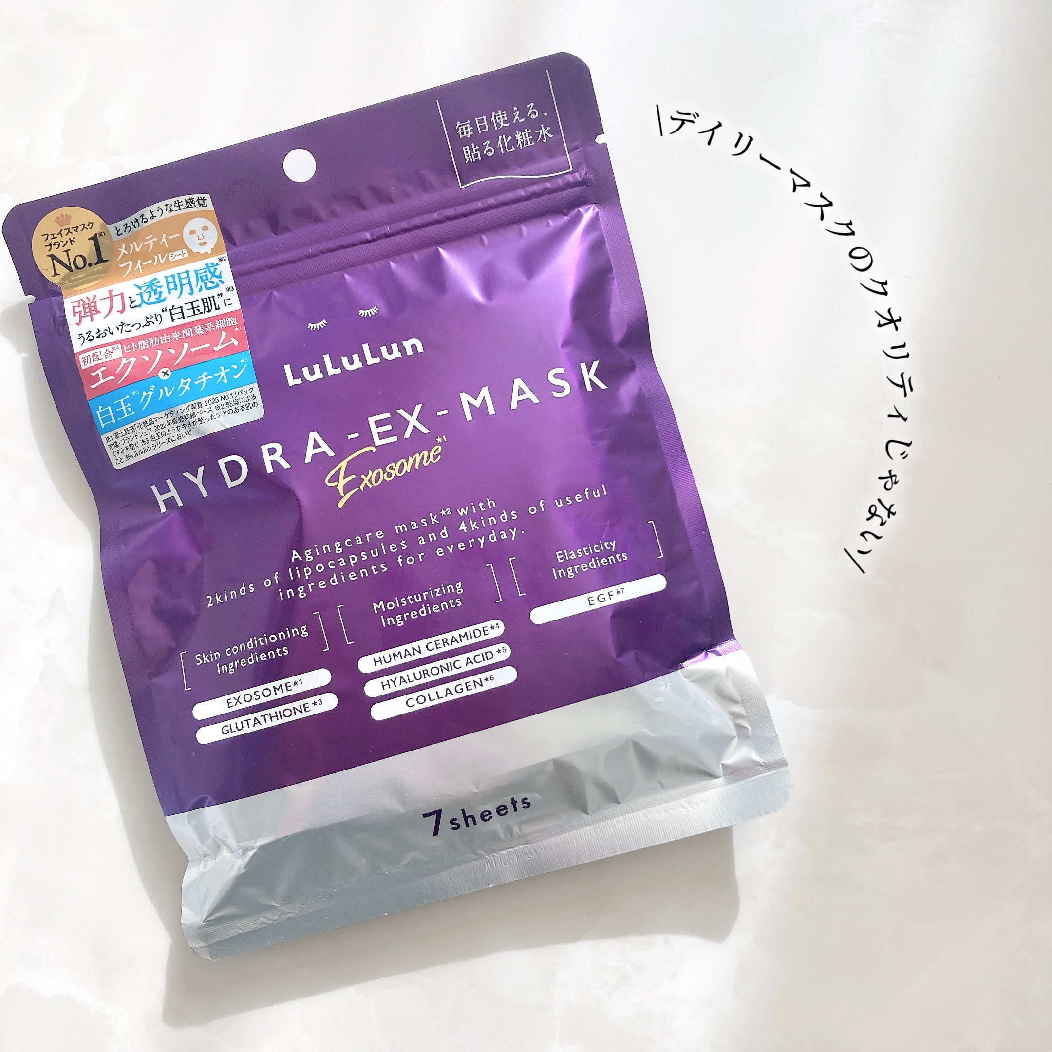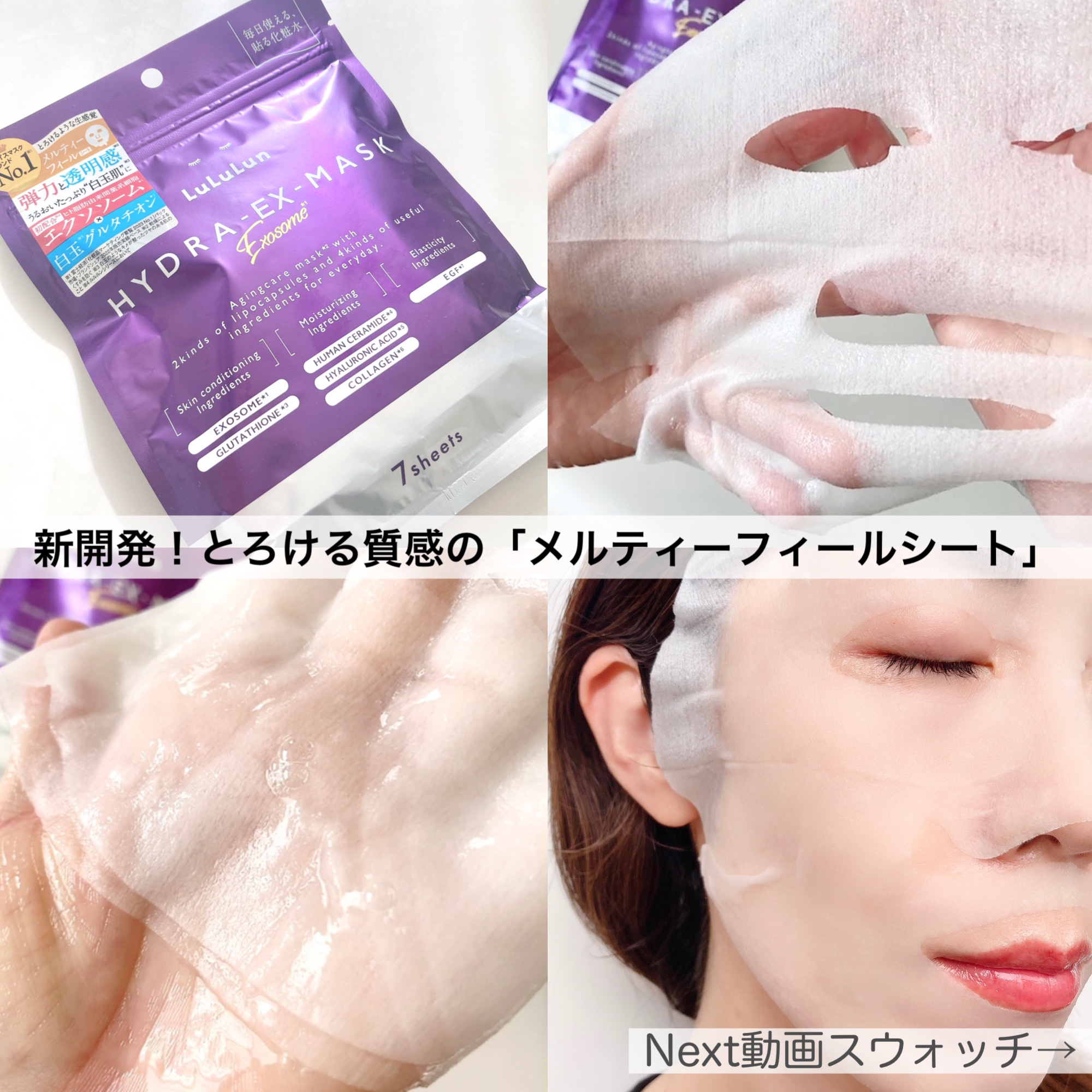 - ルルルンハイドラシリーズから新登場。うるおいにプラスするのは、「エクソソーム*1」。先端再生テクノロジーにインスパイアされた、デイリーエイジングケア※1マスクです。白玉※2グルタチオン*2をプラス配合し、弾力・透明感※3・つやめきのあるなめらかなお肌へ導きます。 (*1 整肌成分 ヒト脂肪由来間葉系細胞エクソソーム *2 整肌成分 グルタチオン、アルブチン、レシチン ※1 年齢に応じて肌へうるおいと弾力を与えるケアのこと ※2 白玉のようなキメが整ったツヤのある肌のこと ※3 うるおいを与えて、乾燥によるくすみを防ぐ)