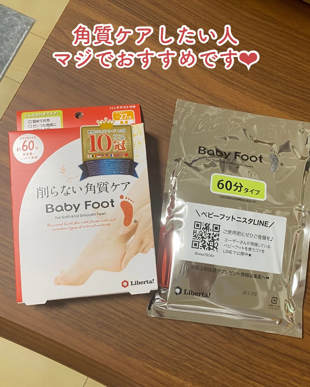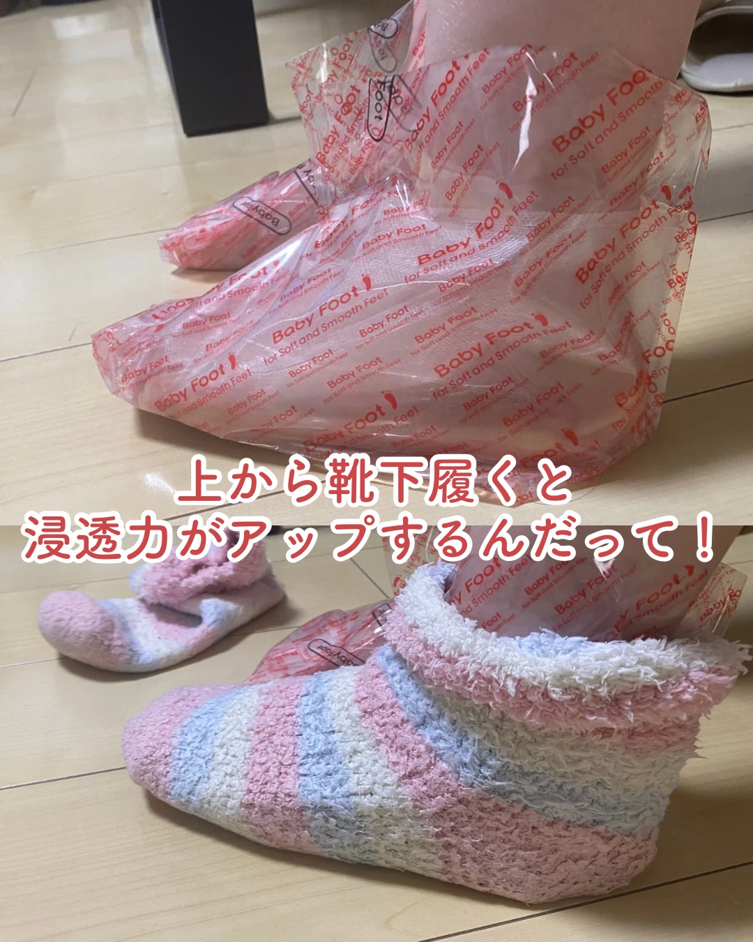 乾燥でカサカサになった足の角質のケアにおすすめのフットパックをご紹介! こちらをお試しするのは2度目ですが、前回角質が綺麗に剥けつるつるになったので今回も楽しみにしていました♡ 使用後3日ほど経つと、お風呂上がりに角質が浮いてくるようになり、少しずつ古い角質が剥がれていきます、もちろん痛みはなし!!