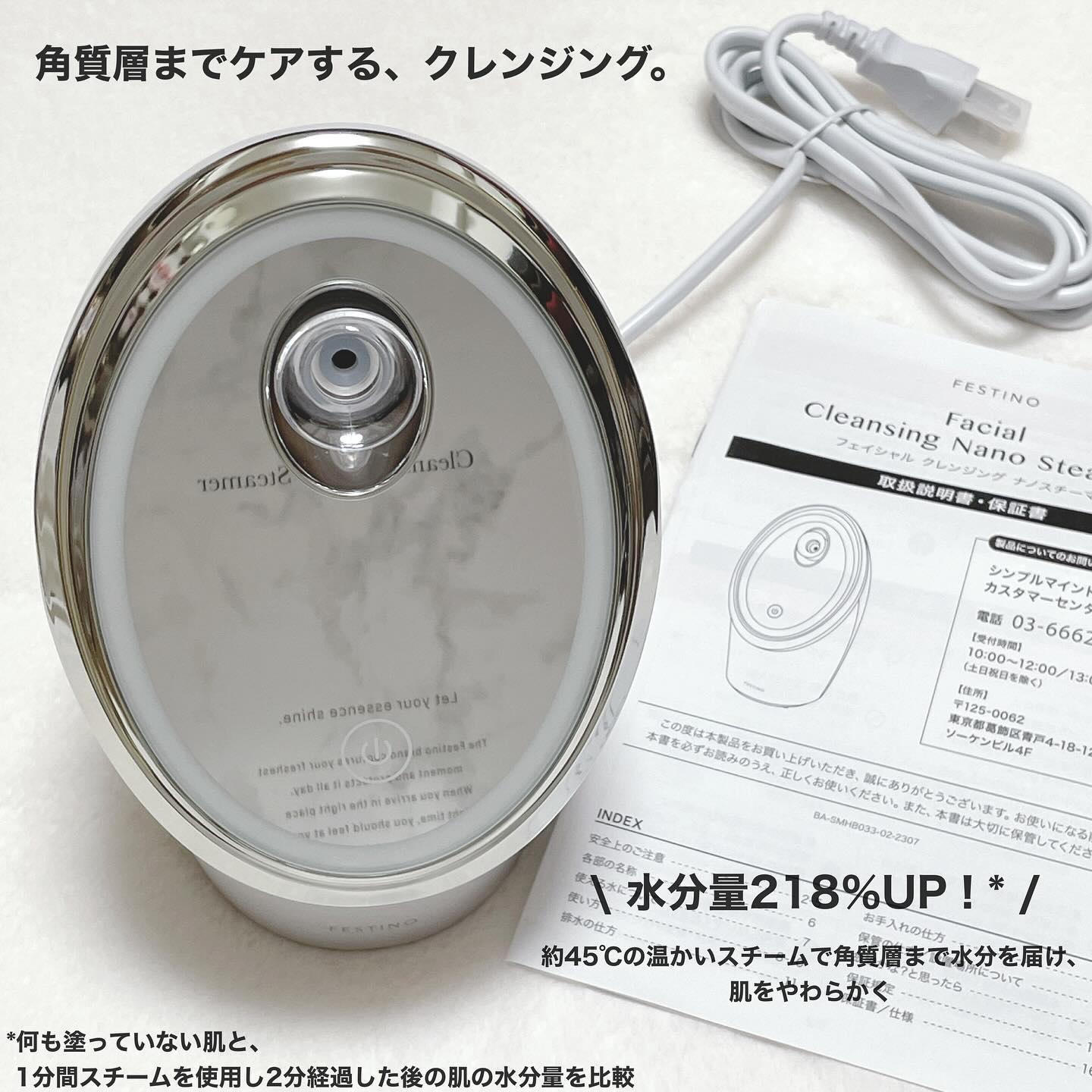 - ナノサイズの温かいスチームで、しっかりメイクもディープクレンジング。 乾燥が気になる肌、パサつく髪、デコルテまでうるおいを届ける。