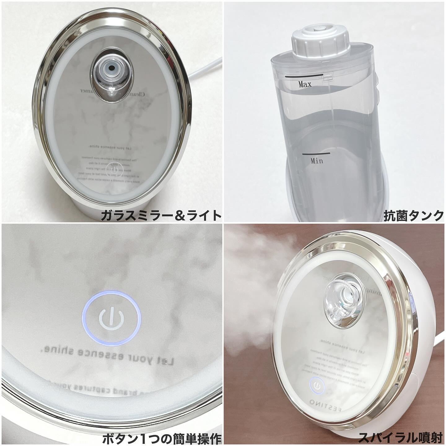 フェスティノ様からいただきました♡フェイシャルクレンジングナノスチーマーコロンとした形がかわいい🧡色はホワイトとサンドベージュの2色、私が使っているのはサンドベージュだよ🥰お部屋に馴染む色で気に入ってる♩お気に入りポイント❤︎鏡になってるから...