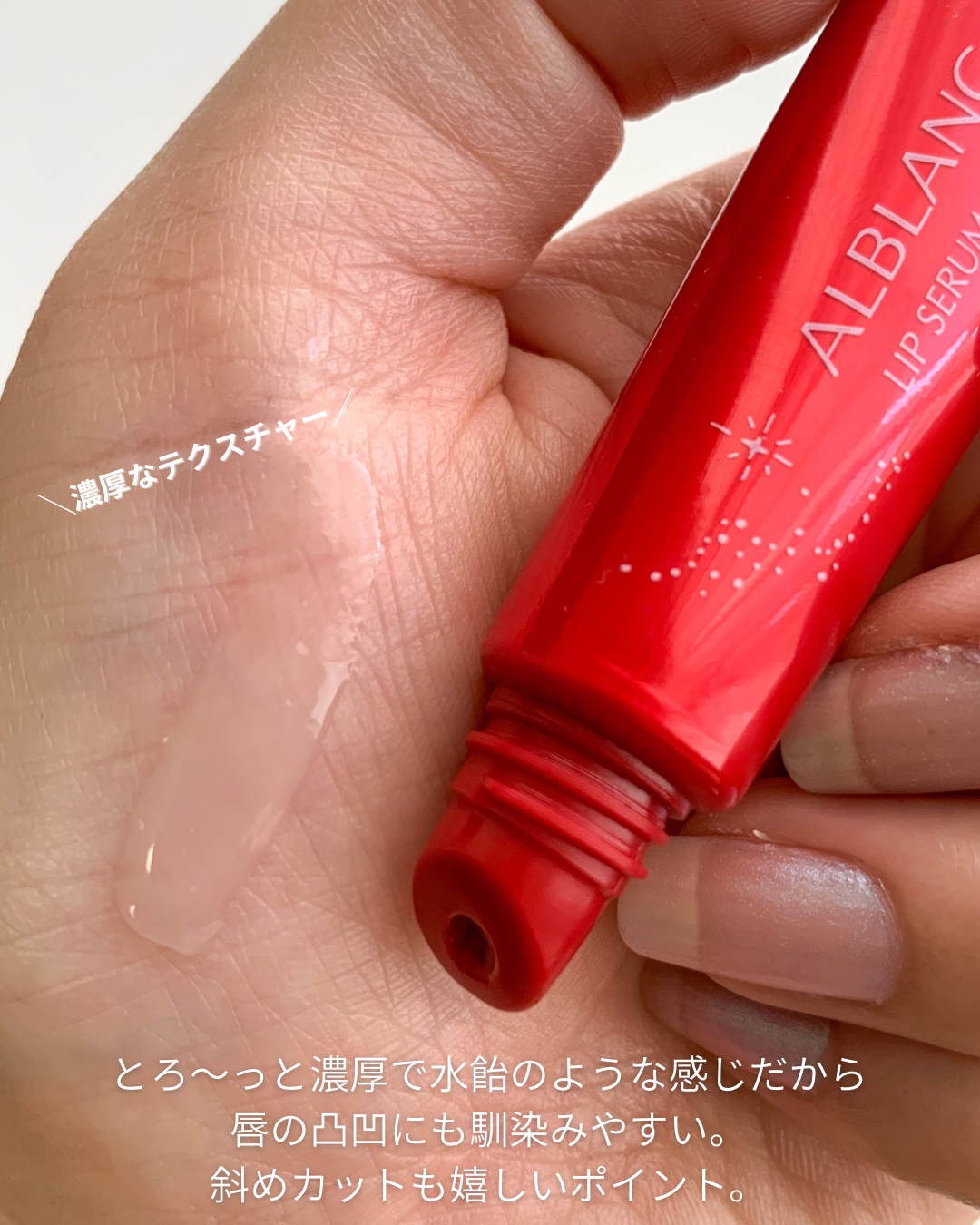 コスメラウンジの企画で、アルブランさんから商品を提供いただきました。\2025年8月23日数量限定販売/ALBLANC/アルブランリップセラムバームRDガーネットをイメージしたカラーで唇を補正して明るい印象にしてくれる✨️唇の凹凸にもなじんで...