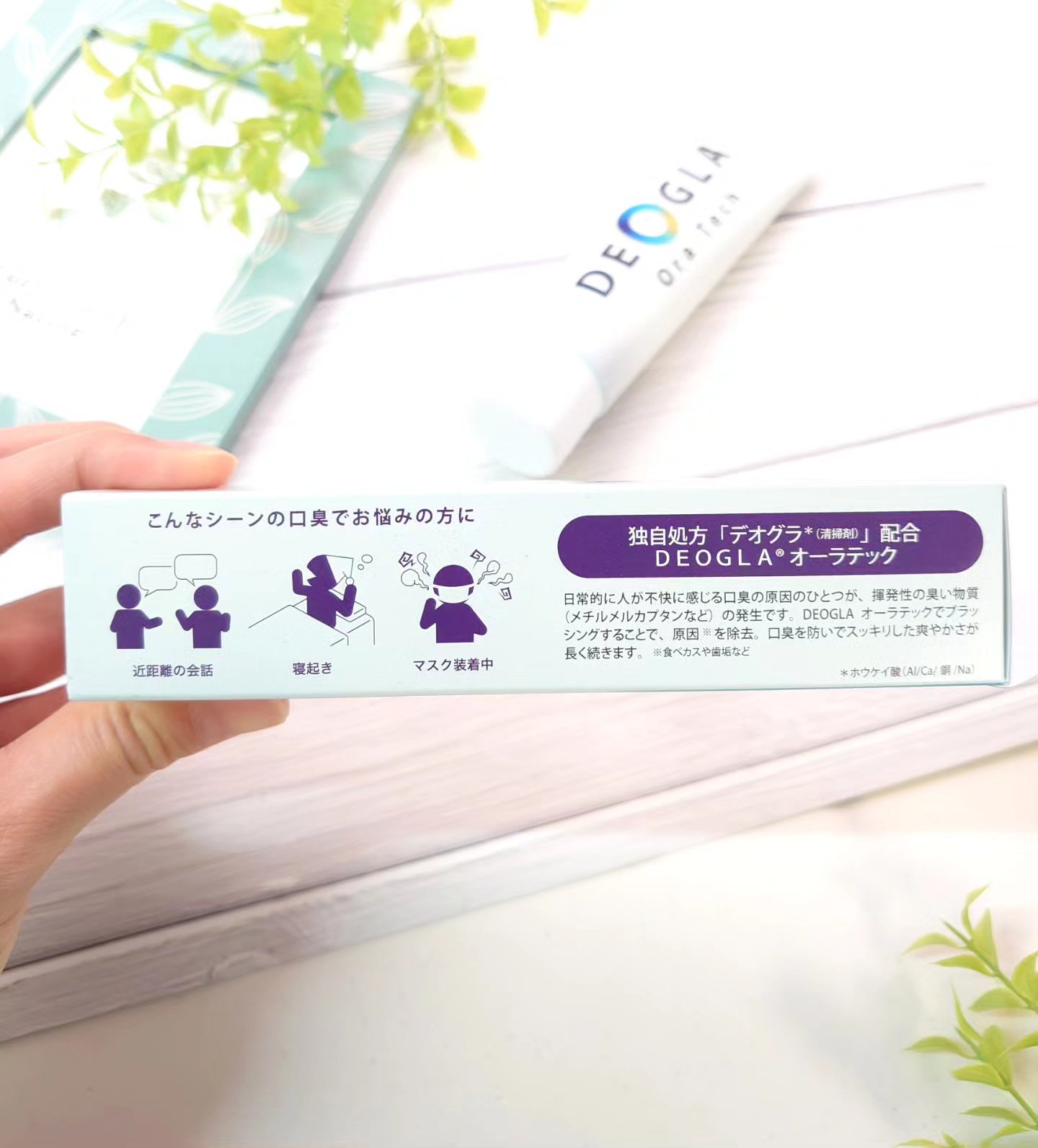 - \独自成分「DEOGLA®︎」(清掃剤)配合/ 創業200年を超える素材メーカーがつくる口臭ケアに特化した歯磨き粉! 製品の特長: 日常的に人が不快に感じる口臭の原因のひとつが、揮発性の臭い物質(メチルメルカプタンなど)の発生です。デオグラオーラテックでブラッシングすることで、原因*を除去。口臭を防いでスッキリした爽やかさが長く続きます。 *食べカスや歯垢など ▶2024.10.1より価格改定及びパッケージリニューアル 1,980円(税込) ▷▷▷ 1,540円(税込) 口臭に特化した処方はそのままに、さらにお求めやすくなりました ▶独自成分DEOGLA : 化粧品成分名称 ホウケイ酸(Al/Ca/銅/Na)