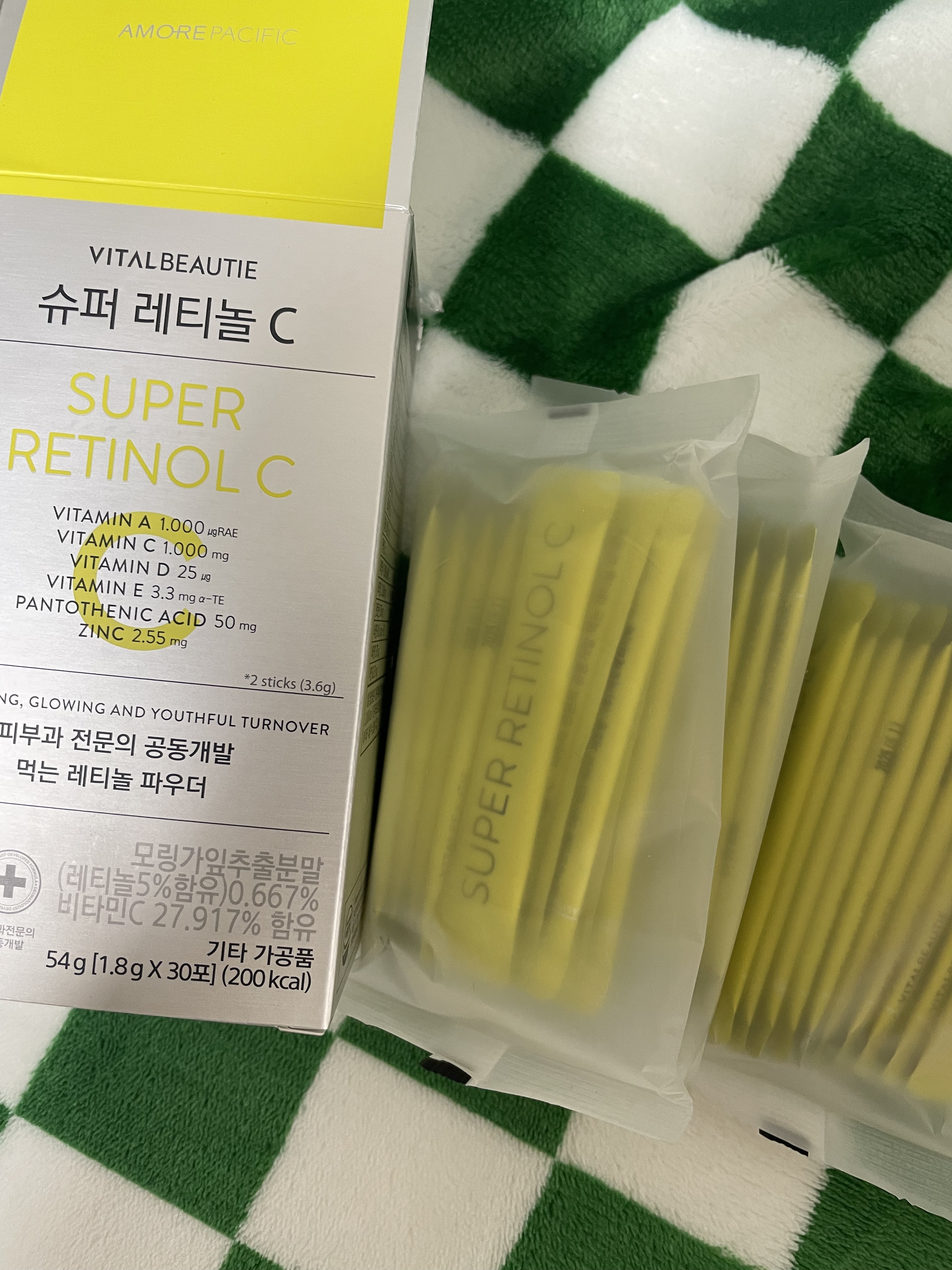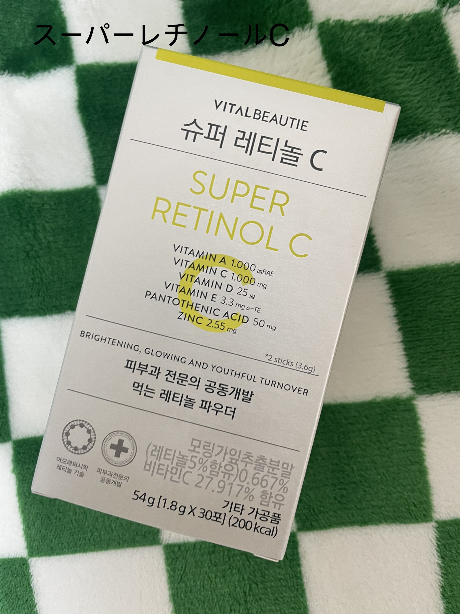 手軽にインナーケアをしたい人におすすめ! 皮膚科専門医とアモーレパシフィック共同で開発された、ヴィーガン認証のレチノール配合のパウダーサプリメント「スーパーレチノールC」 サラサラとしたパウダータイプ。爽やかなシトラス風味のお味🍋 これ1つで手軽に色んな成分を摂取できるのが嬉しい!私はお肌のケアだけじゃなく、体調管理も兼ねて飲んでいます。