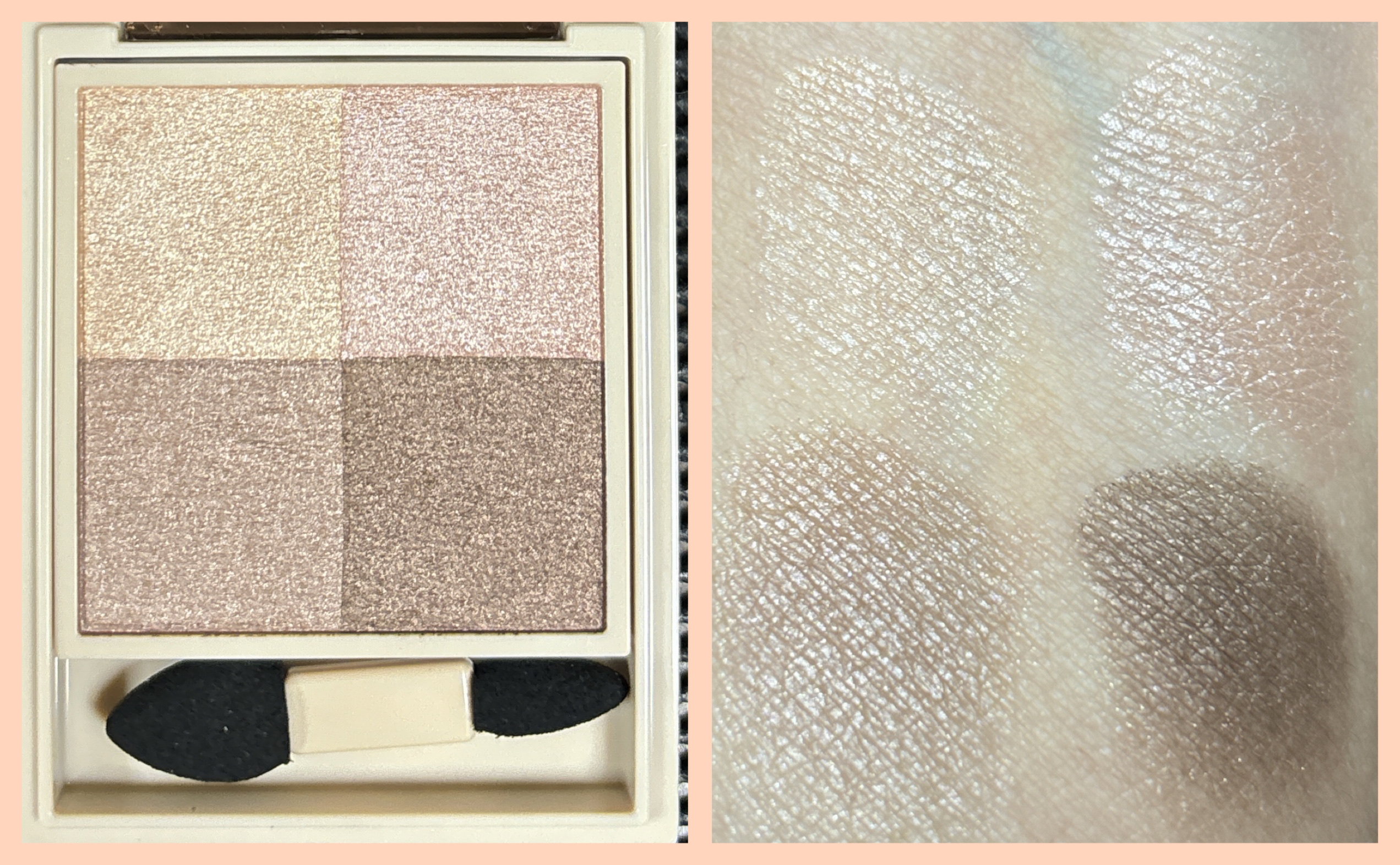 - ● しっとりほぐれるようなタッチで密着し、上品なツヤめきと透け感発色で目もとを彩る 4 色セットアイカラーです。 やさしいトーンの色味と繊細な輝きで、どこか儚げでアンニュイな印象に導きます。 ● レフ板のように光を美しく反射させるライトリフレクションパウダーを配合。 どの角度から見ても、繊細な輝きと濡れたようなツヤを演出します。 ● 透け感があり、軽いタッチでのび広がるクリアパウダーを配合。 色味を重ねても濁りのない透け感発色を叶えます。 ● とてもキメ細かなパウダーに厳選したオイルを組み合わせることで、しっとりなめらかなほぐれ感を実現。 薄膜にのび広がり、まぶたへ溶け込むように密着します。 ● スルスルとした軽い感触のオイルを配合。摩擦抵抗を減らすことで、まばたきや表情の変化によるヨレを防ぎます。 汗や皮脂にもくすみにくいため、時間が経ってもつけたての美しい発色が持続します。 ● まぶたに明るさをあたえ、後から重ねるアイカラーを美しく発色させる「スキンブライトカラー」(A)をセット。 光を味方につけてまぶたのくすみを飛ばし、明るくツヤめく目もとを叶えます。 ● 色ごとに仕切りがないため、1 色ずつはもちろん、パレット内で色を混ぜて塗布することもできます。 ● 美容液成分配合。乾燥しやすい目もとのうるおいをまもります。 ● 無香料