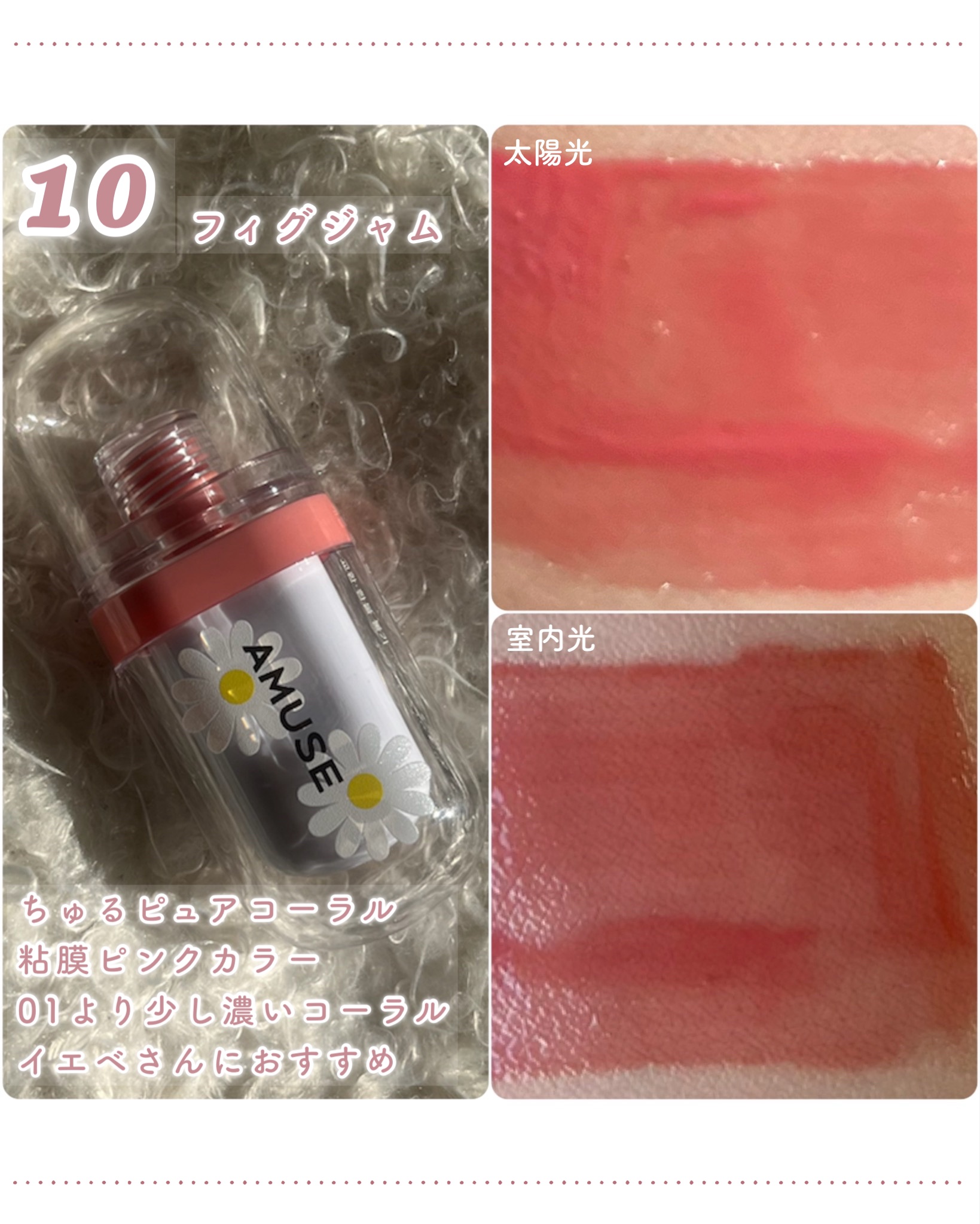 - 濃密なぷにゅっとジェリーが もっちり密着される 長時間持続のジェルフィットティント ☑ぷにゅっとジェリーがもっちり密着される長時間持続&新概念ジェルフィットテクスチャー* ☑8Shadesの透き通るぷにゅっとジェリー発色 ☑3重ツヤシステムで満たせれたぷにゅっとしたジェリーツヤ ☑ジェリーツヤ膜で保湿感ロック ☑手軽いサイズのNEW透明ティント&ぷにゅぷにゅジェリーデザイン ☑ヴィーガン処方 *)AMUSE内において
