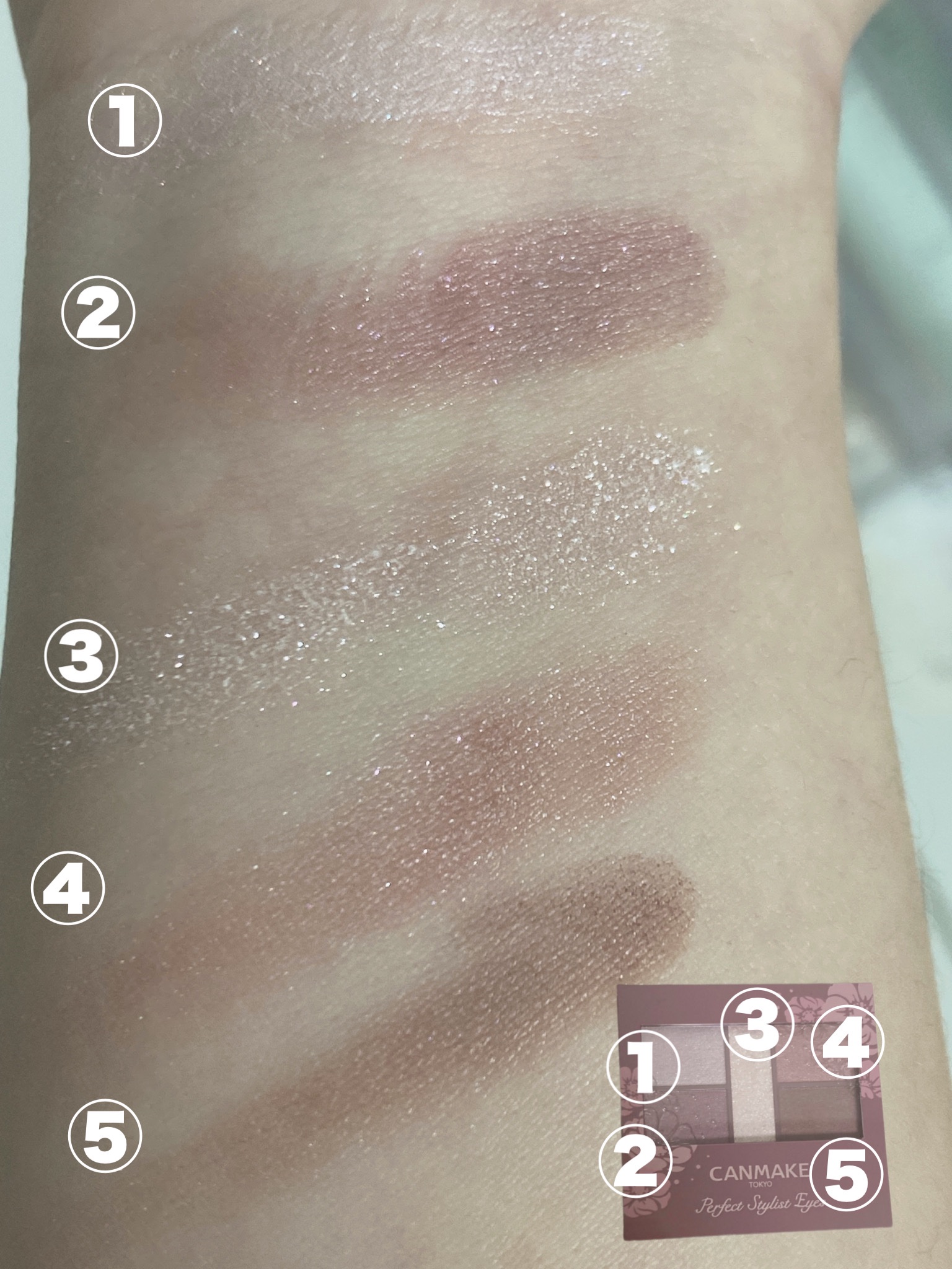 - 1枚のパレットで2つのスタイルが完成! 5色の欲ばりアイシャドウ♥ メインカラーを選んで2つのスタイルが楽しめる! A→B→D でスタイル1 A→C→D でスタイル2 繊細な粉質が、しっとりとまぶたに密着して色落ちを防ぎます。 透明感のあるキラうるトッピングジュエル(繊細ラメ)は、気分によってトッピング!