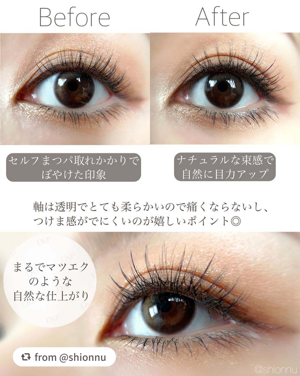 - “ワンタッチ”で理想のまつげが叶うつけまつげです。 最初から束になっているからそのままつけるだけで簡単に”束感まつげ”が完成する01・02、抜け感のあるデザインでサロンで施術した”まつげエクステ”のような仕上がりになる03~06の全6種。 自まつげが少なくても、短くても、生えグセがあっても、誰でもキレイなまつげに。ナチュラルな繊細毛で、自然かつ華やかな目元を演出します。