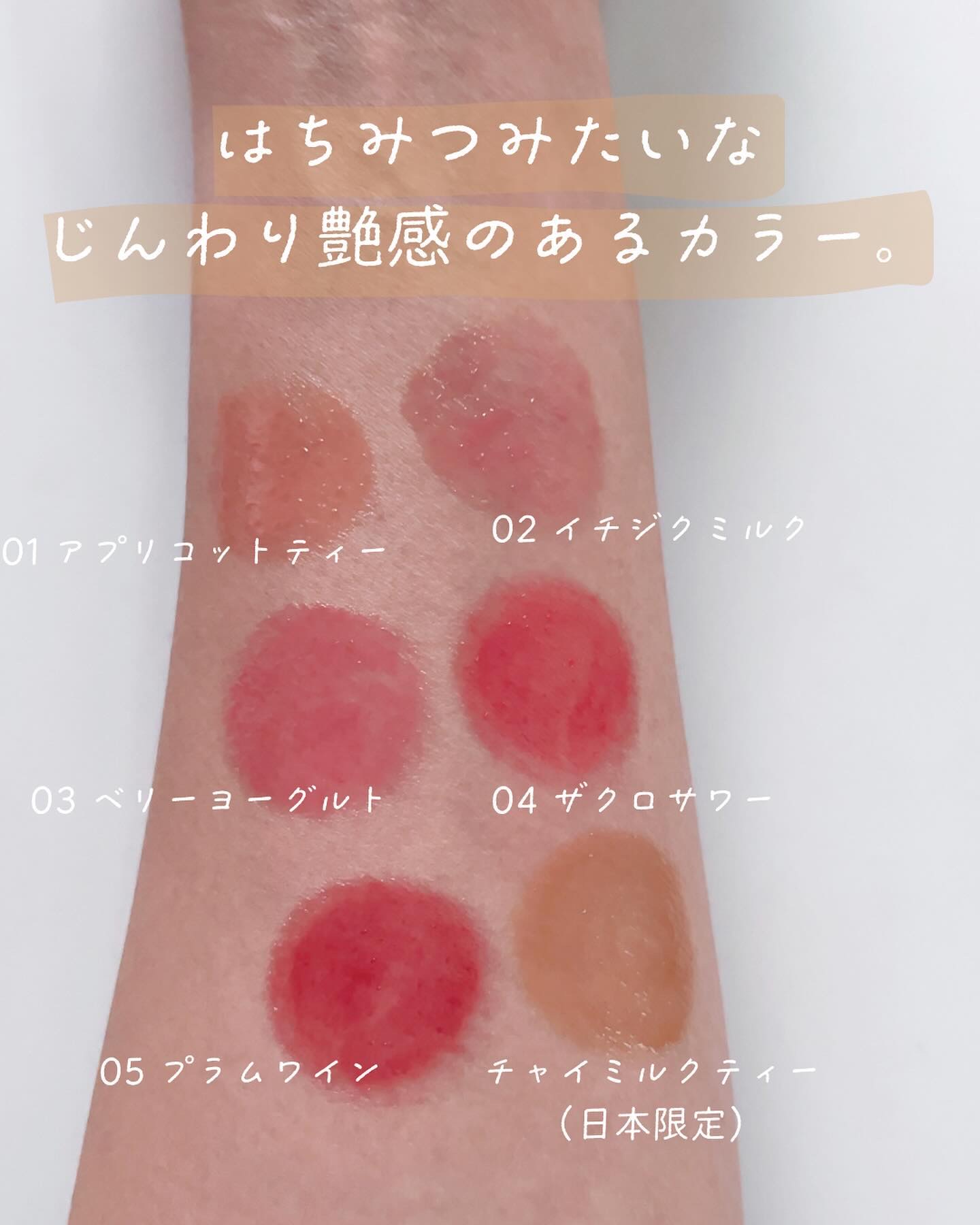 - <01 アプリコットティー> リンゴ酸ジイソステアリル、ダイマージリノール酸ダイマージリノレイルビス(ベヘニル/イソステアリル/フィトステリル)、ビスジグリセリルポリアシルアジペート-2、トリイソステアリン酸ポリグリセリル-2、水添ポリイソブテン、パラフィン、マイクロクリスタリンワックス、ウルシ果皮ロウ、ハチミツエキス、センチフォリアバラ花エキス、マンゴー果実エキス、カニナバラ果実エキス、アーモンド油、アルガニアスピノサ核油、アンズ核油、オリーブ果実油、シア脂、ツバキ種子油、ホホバ種子油、月見草油、BG、トリ(カプリル酸/カプリン酸)グリセリル、1,2-ヘキサンジオール、イソステアリン酸ソルビタン、酢酸トコフェロール、フェノキシエタノール、酸化鉄、酸化チタン、赤202、香料 <02 イチジクミルク> リンゴ酸ジイソステアリル、ダイマージリノール酸ダイマージリノレイルビス(ベヘニル/イソステアリル/フィトステリル)、ビスジグリセリルポリアシルアジペート-2、トリイソステアリン酸ポリグリセリル-2、水添ポリイソブテン、パラフィン、マイクロクリスタリンワックス、ウルシ果皮ロウ、ハチミツエキス、センチフォリアバラ花エキス、マンゴー果実エキス、カニナバラ果実エキス、アーモンド油、アルガニアスピノサ核油、シア脂、オリーブ果実油、アンズ核油、ツバキ種子油、ホホバ種子油、月見草油、BG、トリ(カプリル酸/カプリン酸)グリセリル、1,2-ヘキサンジオール、イソステアリン酸ソルビタン、酢酸トコフェロール、フェノキシエタノール、酸化鉄、酸化チタン、赤202、青1、香料 <03 ベリーヨーグルト> リンゴ酸ジイソステアリル、ダイマージリノール酸ダイマージリノレイルビス(ベヘニル/イソステアリル/フィトステリル)、ビスジグリセリルポリアシルアジペート-2、トリイソステアリン酸ポリグリセリル-2、水添ポリイソブテン、パラフィン、マイクロクリスタリンワックス、ウルシ果皮ロウ、ハチミツエキス、センチフォリアバラ花エキス、マンゴー果実エキス、カニナバラ果実エキス、アーモンド油、アルガニアスピノサ核油、シア脂、オリーブ果実油、アンズ核油、ツバキ種子油、ホホバ種子油、月見草油、BG、トリ(カプリル酸/カプリン酸)グリセリル、1,2-ヘキサンジオール、イソステアリン酸ソルビタン、酢酸トコフェロール、フェノキシエタノール、酸化鉄、酸化チタン、赤202、黄5、香料 <04 ザクロサワー> リンゴ酸ジイソステアリル、ダイマージリノール酸ダイマージリノレイルビス(ベヘニル/イソステアリル/フィトステリル)、ビスジグリセリルポリアシルアジペート-2、トリイソステアリン酸ポリグリセリル-2、水添ポリイソブテン、パラフィン、マイクロクリスタリンワックス、ウルシ果皮ロウ、ハチミツエキス、センチフォリアバラ花エキス、マンゴー果実エキス、カニナバラ果実エキス、アーモンド油、アルガニアスピノサ核油、シア脂、オリーブ果実油、アンズ核油、ツバキ種子油、ホホバ種子油、月見草油、BG、トリ(カプリル酸/カプリン酸)グリセリル、1,2-ヘキサンジオール、イソステアリン酸ソルビタン、酢酸トコフェロール、フェノキシエタノール、黄5、赤202、香料 <05 プラムワイン> リンゴ酸ジイソステアリル、ダイマージリノール酸ダイマージリノレイルビス(ベヘニル/イソステアリル/フィトステリル)、ビスジグリセリルポリアシルアジペート-2、トリイソステアリン酸ポリグリセリル-2、水添ポリイソブテン、パラフィン、マイクロクリスタリンワックス、ウルシ果皮ロウ、ハチミツエキス、センチフォリアバラ花エキス、マンゴー果実エキス、カニナバラ果実エキス、アーモンド油、アルガニアスピノサ核油、シア脂、オリーブ果実油、アンズ核油、ツバキ種子油、ホホバ種子油、月見草油、BG、トリ(カプリル酸/カプリン酸)グリセリル、1,2-ヘキサンジオール、イソステアリン酸ソルビタン、酢酸トコフェロール、フェノキシエタノール、酸化鉄、赤202、青1、香料 <06 チャイミルクティー> リンゴ酸ジイソステアリル、ダイマージリノール酸ダイマージリノレイルビス(ベヘニル/イソステアリル/フィトステリル)、ビスジグリセリルポリアシルアジペート-2、トリイソステアリン酸ポリグリセリル-2、水添ポリイソブテン、パラフィン、マイクロクリスタリンワックス、ハチミツエキス、センチフォリアバラ花エキス、マンゴー果実エキス、カニナバラ果実エキス、アーモンド油、アルガニアスピノサ核油、シア脂、オリーブ果実油、アンズ核油、ツバキ種子油、ホホバ種子油、月見草油、BG、トリ(カプリル酸/カプリン酸)グリセリル、水、1,2-ヘキサンジオール、イソステアリン酸ソルビタン、BHT、酢酸トコフェロール、フェノキシエタノール、酸化チタン、酸化鉄、香料 <21 ダーティチョコ> リンゴ酸ジイソステアリル、ダイマージリノール酸ダイマージリノレイルビス(ベヘニル/イソステアリル/フィトステリル)、ビスジグリセリルポリアシル