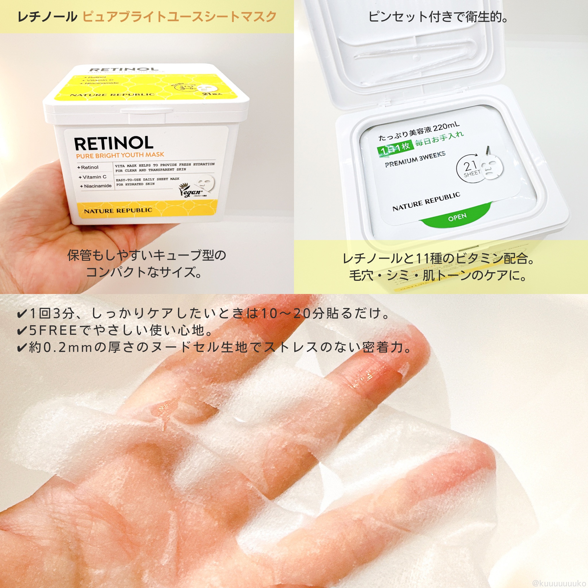 ネイチャーリパブリックのキューブマスク🟨・レチノールピュアブライトユースシートマスクヴィーガンのシートマスクにウォータータイプの美容液がヒタヒタに染み込んでいて、角質層のすみずみまでぐんぐん浸透💛くすんだお肌もワントーンアップしました✨レチノ...