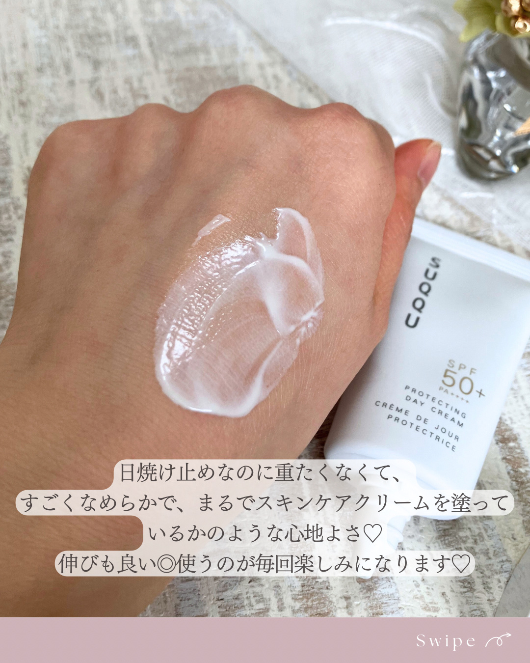 - SPF50+・PA++++ ベースメイクの仕上がりを高め、表情まで活き活きと見せるなめらかな艶のヴェール。 日中の肌を長時間うるおいで満たし続けるスキンケアクリームのような心地良さ。 日焼け止めを塗ることが義務ではなく、むしろすすんで手にとりたくなる。 そんなUVクリームの誕生です。 紫外線のみならず、肌表面に花粉やほこりなどの微粒子汚れが付着するのを物理的に防ぎながら※1 、光を味方につけてSUQQUらしい艶肌へと導きます。 ※1 乾燥、花粉やほこりなどの微粒子汚れ。すべての微粒子汚れの付着を防ぐわけではありません。