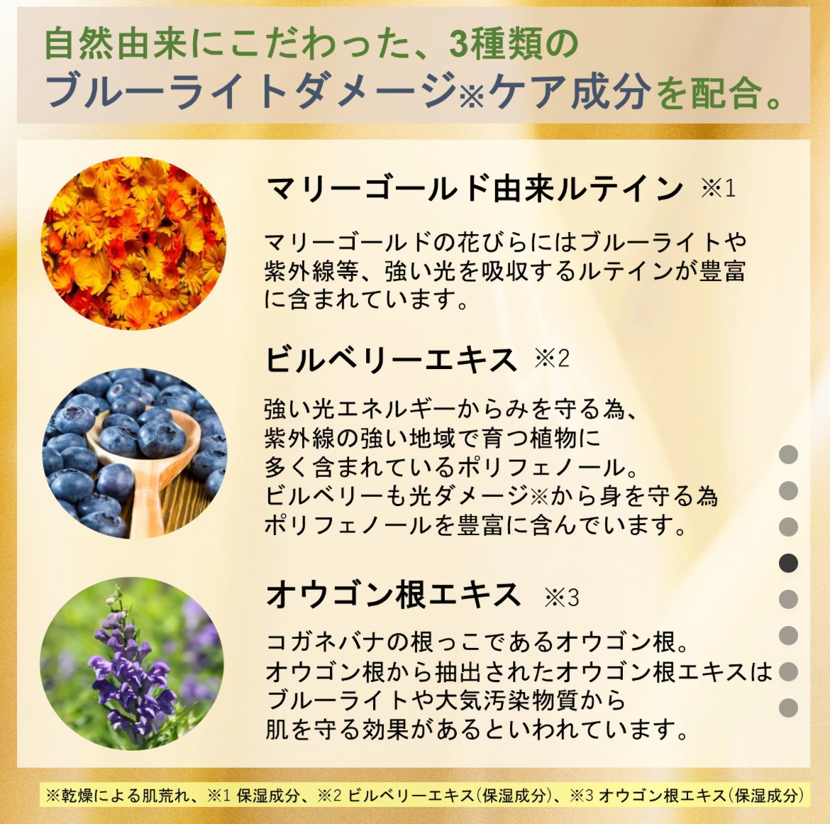 ブルーライトも紫外線よりは弱いですが肌には良くない(·へ·) 紫外線の多くは目から入るみたいで、目が眩しいとなっただけでもアウト😅 ブルーライトカット加工(UVカット加工も)のされたメガネや化粧品、目薬さして予防しましょう💪 ルテインやブルーベリー等のサプリメントも出ています。