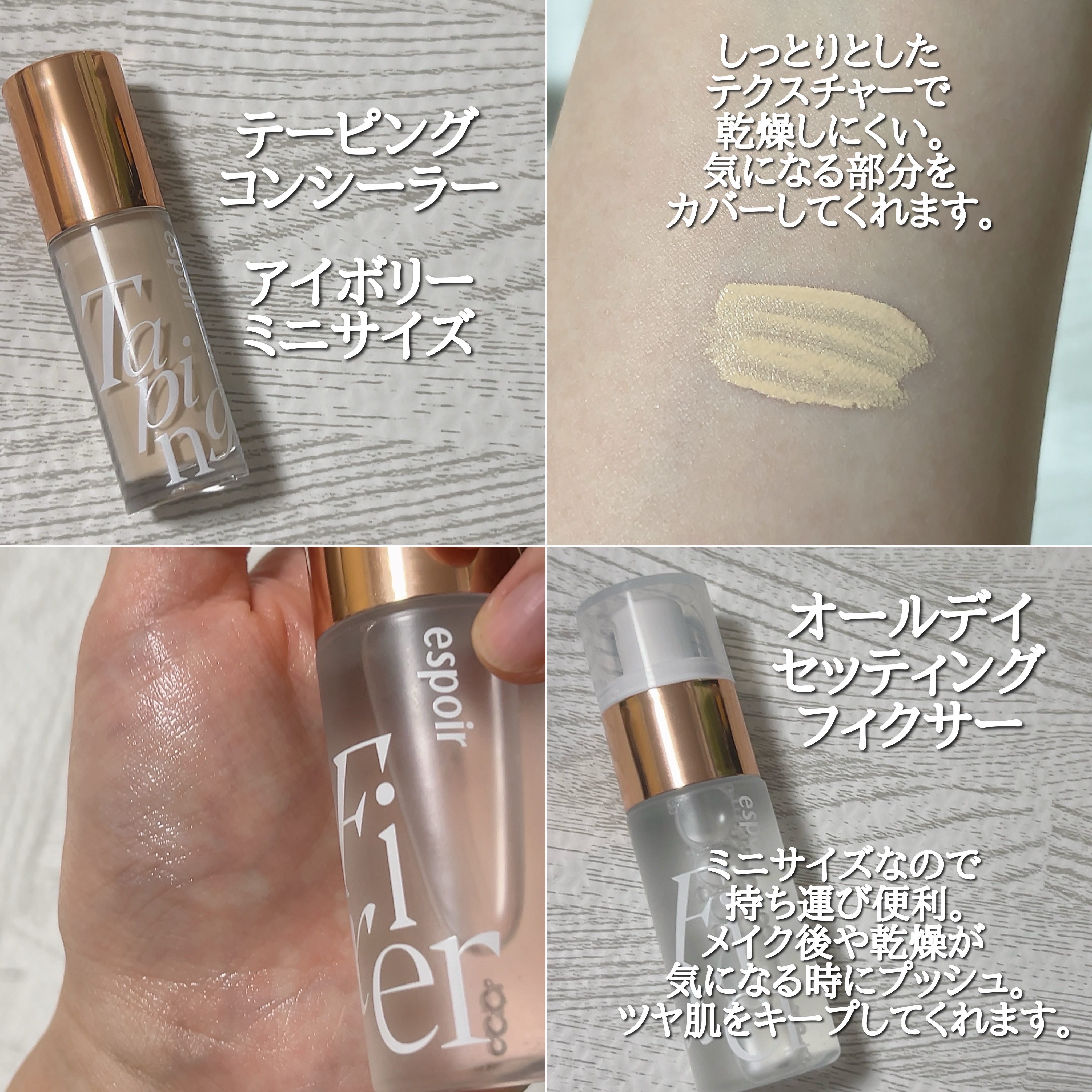クッションファンデは軽いつけ心地で自然にカバー。 ヨレにくく、乾燥しにくいのも⭕️ コンシーラーは明るめなのでハイライトとしても使用可能。 しっとりと肌にフィットします。 フィクサーはミニサイズなので持ち運び便利。 乾燥が気になる時にプッシュすれば乾燥知らず。