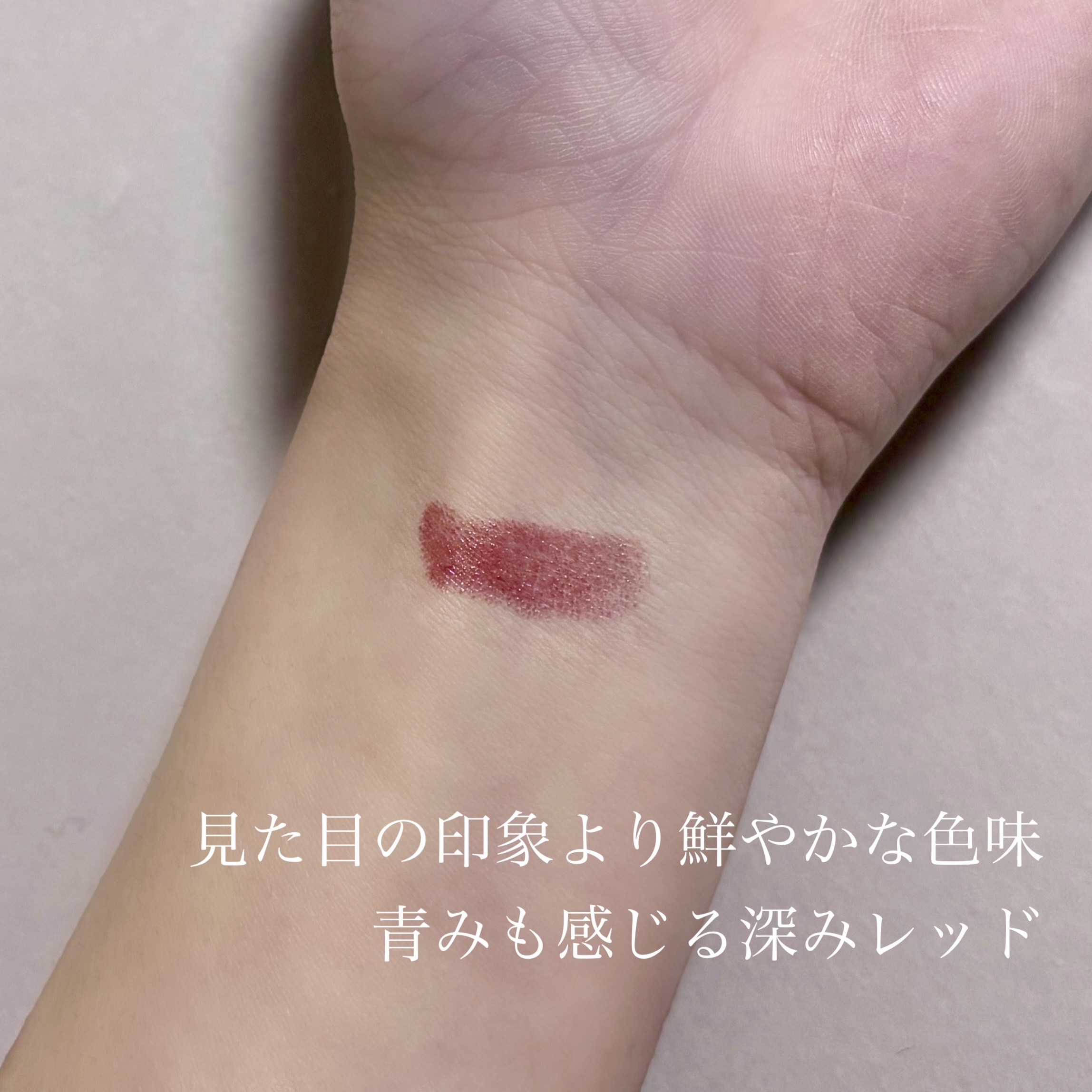 パッケージか女児アニメっぽくてかわいい。正直パケ買い。 色味がとても好み。リップスティックの色味は結構ダークな感じ。でも、くちびるに乗せると見た目ほど暗くない。ほんのりピンク感じる赤。ベリー系。ラズベリーっぽいかな。 塗り方でかなり雰囲気が変わる色だと思う。 05 フィグピューレも持っているんだけど、こちらの色味は熟し切る前のいちごっぽい感じ。鮮やかな色味に発色するように感じた。時間が立つと朱色っぽく浮いてしまって、私には合わなかった。 塗り心地が滑らかで使いやすい。こってり系ではあるんだけど、韓国コスメのバームリップよりは軽い。むちっと感がありつつ、髪の毛がくっつかない程度の軽さはある。 プランパーのスースーした感じも、そこまで強くない。メンソール入りのリップクリームくらい。 落ち方がちょっと気になる時もあるけど(毎回じゃない)、濃い色だから仕方ないかなとも思う。フチだけ残る落ち方。