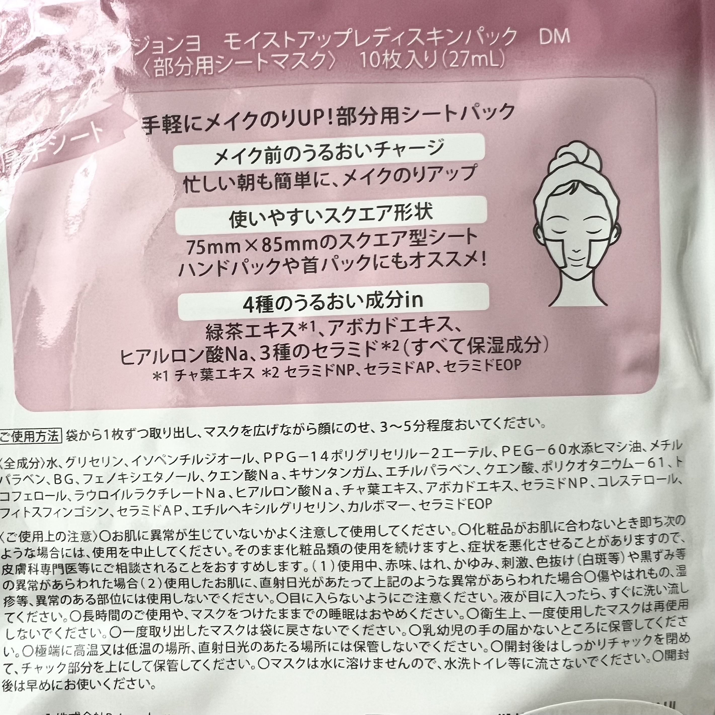 - 手軽にメイクのりUP!部分用シートパック ・メイク前のうるおいチャージ 忙しい朝も簡単に、メイクのリアップ ・使いやすいスクエア形状 75mm×85mmのスクエア型シート ハンドパックや首パックにもオススメ! ・4種のうるおい成分in(すべて保湿成分) *1緑茶エキス/*2セイヨウナシ果汁発酵液/ユキノシタエキス/グリチルリチン酸2K *1チャ葉エキス *2乳酸桿菌/セイヨウナシ果汁発酵液 ミシン目入りになってリニューアル発売 ※2025年8月18日、29日〜順次リニューアル リニューアルに伴い商品名を「ウォンジョンヨ モイストアップレディスキンパック」から「ウォンジョンヨ モイストアップレディスキンパック N」へ変更しました。 【発売日】 <50枚入り> 8月18日(月)より全国のバラエティショップにて順次発売開始 ※公式オンラインストア、楽天、Qoo10、Amazonは順次切り替え予定 <12枚入り/10枚入り> 8月18日(月)よりロフトにて順次発売開始(モイストアップレディスキンパック・モイストアップレディスキンパック DMのみ) 8月29日(金)より全国のバラエティショップ・公式オンラインストアにて発売開始 【取扱店】ウォンジョンヨ公式オンラインストア、Amazon、Qoo10、楽天、アインズ&トルペ、アットコスメ、R.O.U、イオン、京王アートマン、ショップイン、チャーリー、ハンズ、マツモトキヨシ、プラザ、ローズマリー、ロフト(一部店舗除く)