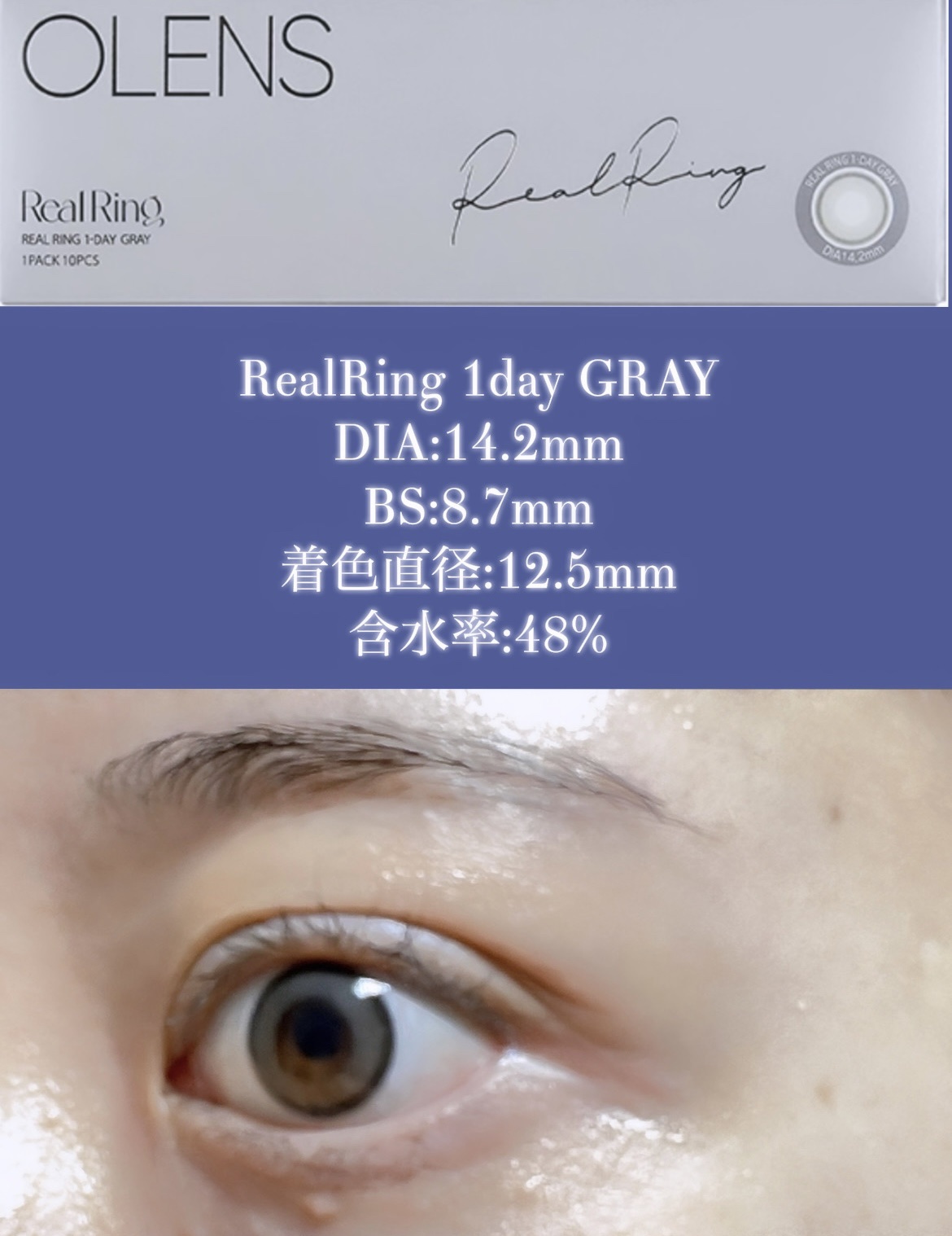 【ナチュラル派カラコン💛4色比較レポ】#OLENS#POPLENS#RealRing1day(1箱10枚入)DIA:14.2mm着色直径:12.5mm含水率:48%■GRAY青みの少ないニュートラル系初めてのグレーカラコンや、普段使いしたい人...