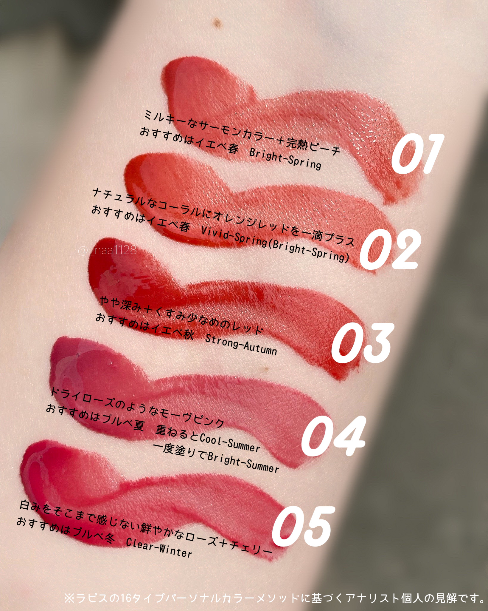 - <01. ピーチアンバー> 水、リンゴ酸ジイソステアリル、ビスジグリセリルポリアシルアジペート-2、ジフェニルシロキシフェニルトリメチコン、ジフェニルジメチコン、水添ポリイソブテン、BG、グリセリン、1,2-ヘキサンジオール、セテアレス-20、セテアリルアルコール、セチルPEG/PPG-10/1ジメチコン、(アクリル酸ヒドロキシエチル/アクリロイルジメチルタウリンNa)コポリマー、ポリソルベート60、フェノキシエタノール、スクワラン、香料、エチルヘキシルグリセリン、EDTA-2Na、イソステアリン酸ソルビタン、水酸化Al、ポリアクリル酸アンモニウム、ホホバ種子油、月見草油、アボカド油、モモ果実エキス、ステアリン酸Na、クエン酸、テトラ(ジ-t-ブチルヒドロキシヒドロケイヒ酸)ペンタエリスリチル、クダモノトケイソウ果実エキス、ヤエヤマアオキ果実エキス、ミルシアリアデュビア果実エキス、アンマロク果実エキス、ヒポファエラムノイデス果実エキス、テルミナリアフェルジナンジアナ果実エキス、酸化チタン、黄5、赤227、赤104(1)、黄4、青1 <02.アプリコットサイダー> 水、リンゴ酸ジイソステアリル、ビスジグリセリルポリアシルアジペート-2、ジフェニルシロキシフェニルトリメチコン、水添ポリイソブテン、ジフェニルジメチコン、BG、グリセリン、1,2-ヘキサンジオール、セテアレス-20、セテアリルアルコール、セチルPEG/PPG-10/1ジメチコン、(アクリル酸ヒドロキシエチル/アクリロイルジメチルタウリンNa)コポリマー、ポリソルベート60、フェノキシエタノール、スクワラン、香料、エチルヘキシルグリセリン、EDTA-2Na、イソステアリン酸ソルビタン、アボカド油、ホホバ種子油、月見草油、モモ果実エキス、ステアリン酸Na、クエン酸、テトラ(ジ-t-ブチルヒドロキシヒドロケイヒ酸)ペンタエリスリチル、アンマロク果実エキス、クダモノトケイソウ果実エキス、ヒポファエラムノイデス果実エキス、テルミナリアフェルジナンジアナ果実エキス、ヤエヤマアオキ果実エキス、ミルシアリアデュビア果実エキス、酸化チタン、黄5、赤227、赤104(1)、青1 <03.モロッコホリデーズ> 水、リンゴ酸ジイソステアリル、ビスジグリセリルポリアシルアジペート-2、ジフェニルシロキシフェニルトリメチコン、ジフェニルジメチコン、水添ポリイソブテン、BG、グリセリン、1,2-ヘキサンジオール、セテアレス-20、セテアリルアルコール、セチルPEG/PPG-10/1ジメチコン、(アクリル酸ヒドロキシエチル/アクリロイルジメチルタウリンNa)コポリマー、ポリソルベート60、フェノキシエタノール、スクワラン、香料、エチルヘキシルグリセリン、EDTA-2Na、イソステアリン酸ソルビタン、水酸化Al、ポリアクリル酸アンモニウム、ホホバ種子油、月見草油、アボカド油、モモ果実エキス、ステアリン酸Na、クエン酸、テトラ(ジ-t-ブチルヒドロキシヒドロケイヒ酸)ペンタエリスリチル、クダモノトケイソウ果実エキス、ヤエヤマアオキ果実エキス、ミルシアリアデュビア果実エキス、アンマロク果実エキス、ヒポファエラムノイデス果実エキス、テルミナリアフェルジナンジアナ果実エキス、酸化チタン、黄5、赤227、赤104(1)、青1、黄4 <04. リトルモーブ> 水、リンゴ酸ジイソステアリル、ビスジグリセリルポリアシルアジペート-2、ジフェニルシロキシフェニルトリメチコン、ジフェニルジメチコン、水添ポリイソブテン、BG、グリセリン、1,2-ヘキサンジオール、セテアレス-20、セテアリルアルコール、セチルPEG/PPG-10/1ジメチコン、(アクリル酸ヒドロキシエチル/アクリロイルジメチルタウリンNa)コポリマー、ポリソルベート60、フェノキシエタノール、スクワラン、香料、エチルヘキシルグリセリン、EDTA-2Na、イソステアリン酸ソルビタン、水酸化Al、ポリアクリル酸アンモニウム、ホホバ種子油、月見草油、アボカド油、モモ果実エキス、ステアリン酸Na、クエン酸、テトラ(ジ-t-ブチルヒドロキシヒドロケイヒ酸)ペンタエリスリチル、クダモノトケイソウ果実エキス、ヤエヤマアオキ果実エキス、ミルシアリアデュビア果実エキス、アンマロク果実エキス、ヒポファエラムノイデス果実エキス、テルミナリアフェルジナンジアナ果実エキス、酸化チタン、赤227、赤104(1)、黄5、黄4、青1 <05.ローズティー> 水、リンゴ酸ジイソステアリル、ビスジグリセリルポリアシルアジペート-2、ジフェニルシロキシフェニルトリメチコン、ジフェニルジメチコン、水添ポリイソブテン、BG、グリセリン、1,2-ヘキサンジオール、セテアレス-20、セテアリルアルコール、セチルPEG/PPG-10/1ジメチコン、(アクリル酸ヒドロキシエチル/アクリロイルジメチルタウリンNa)コポリマー、ポリソルベート60、フェノキシエタノール、スクワラン、香料、エチルヘキシルグリセリン、EDTA-2Na、イソステアリン酸ソルビタン、水酸化Al、ポリアクリル酸アンモニウム、ホホバ種子油、月見草油、アボカド油、モモ果実エキス、ステアリン酸Na、クエン酸、テトラ(ジ-t-ブチルヒドロキシヒドロケイヒ