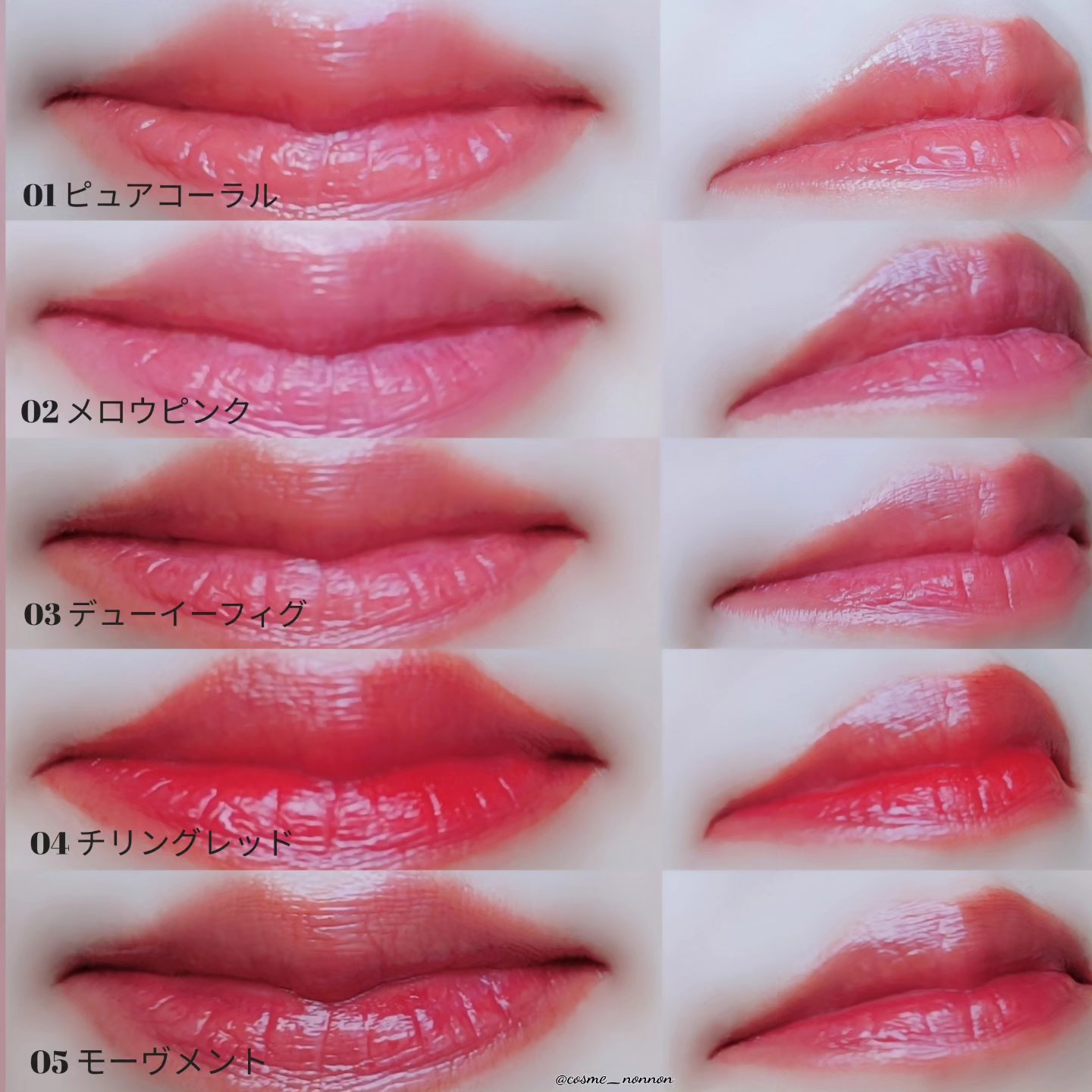 - <ピュアコーラル> 水、トリメチルシロキシフェニルジメチコン、オクチルドデカノール、ダイマージリノール酸ダイマージリノレイルビス(ベヘニル/イソステアリル/フィトステリル)、ポリアミド-8、リンゴ酸ジイソステアリル、ポリソルベート60、BG、セタノール、グリセリン、セスキオレイン酸ソルビタン、変性アルコール、(アクリル酸ヒドロキシエチル/アクリロイルジメチルタウリンNa)コポリマー、ヨーロッパキイチゴ葉エキス、(カプリル酸/カプリン酸)ヤシアルキル、加水分解ヒアルロン酸、(ヒマシ油/IPDI)コポリマー、(カプリル酸/カプリン酸/コハク酸)トリグリセリル、エチルヘキシルグリセリン、トリ(カプリル酸/カプリン酸)グリセリル、カプリリルグリコール、1,2-ヘキサンジオール、トコフェロール、ポリアクリレート-13、ポリイソブテン、テトラ(ジ-t-ブチルヒドロキシヒドロケイヒ酸)ペンタエリスリチル、イソステアリン酸ソルビタン、ポリソルベート20、デヒドロ酢酸、フィチン酸Na、香料、酸化チタン、黄5、赤227、青1 <メロウピンク> 水、トリメチルシロキシフェニルジメチコン、オクチルドデカノール、ダイマージリノール酸ダイマージリノレイルビス(ベヘニル/イソステアリル/フィトステリル)、ポリアミド-8、リンゴ酸ジイソステアリル、ポリソルベート60、BG、セタノール、グリセリン、セスキオレイン酸ソルビタン、変性アルコール、(アクリル酸ヒドロキシエチル/アクリロイルジメチルタウリンNa)コポリマー、ヨーロッパキイチゴ葉エキス、(カプリル酸/カプリン酸)ヤシアルキル、加水分解ヒアルロン酸、(ヒマシ油/IPDI)コポリマー、(カプリル酸/カプリン酸/コハク酸)トリグリセリル、エチルヘキシルグリセリン、トリ(カプリル酸/カプリン酸)グリセリル、カプリリルグリコール、1,2-ヘキサンジオール、トコフェロール、ポリアクリレート-13、ポリイソブテン、テトラ(ジ-t-ブチルヒドロキシヒドロケイヒ酸)ペンタエリスリチル、イソステアリン酸ソルビタン、ポリソルベート20、デヒドロ酢酸、フィチン酸Na、香料、酸化チタン、黄5、赤227、青1 <デューイーフィグ> 水、トリメチルシロキシフェニルジメチコン、オクチルドデカノール、ダイマージリノール酸ダイマージリノレイルビス(ベヘニル/イソステアリル/フィトステリル)、ポリアミド-8、リンゴ酸ジイソステアリル、ポリソルベート60、BG、セタノール、グリセリン、セスキオレイン酸ソルビタン、変性アルコール、(アクリル酸ヒドロキシエチル/アクリロイルジメチルタウリンNa)コポリマー、ヨーロッパキイチゴ葉エキス、(カプリル酸/カプリン酸)ヤシアルキル、加水分解ヒアルロン酸、(ヒマシ油/IPDI)コポリマー、(カプリル酸/カプリン酸/コハク酸)トリグリセリル、エチルヘキシルグリセリン、トリ(カプリル酸/カプリン酸)グリセリル、カプリリルグリコール、1,2-ヘキサンジオール、トコフェロール、ポリアクリレート-13、ポリイソブテン、テトラ(ジ-t-ブチルヒドロキシヒドロケイヒ酸)ペンタエリスリチル、イソステアリン酸ソルビタン、ポリソルベート20、デヒドロ酢酸、フィチン酸Na、香料、酸化チタン、黄5、赤227、青1 <チリングレッド> 水、トリメチルシロキシフェニルジメチコン、オクチルドデカノール、ダイマージリノール酸ダイマージリノレイルビス(ベヘニル/イソステアリル/フィトステリル)、ポリアミド-8、リンゴ酸ジイソステアリル、ポリソルベート60、BG、セタノール、グリセリン、セスキオレイン酸ソルビタン、変性アルコール、(アクリル酸ヒドロキシエチル/アクリロイルジメチルタウリンNa)コポリマー、ヨーロッパキイチゴ葉エキス、(カプリル酸/カプリン酸)ヤシアルキル、加水分解ヒアルロン酸、(ヒマシ油/IPDI)コポリマー、(カプリル酸/カプリン酸/コハク酸)トリグリセリル、エチルヘキシルグリセリン、トリ(カプリル酸/カプリン酸)グリセリル、カプリリルグリコール、1,2-ヘキサンジオール、トコフェロール、ポリアクリレート-13、ポリイソブテン、テトラ(ジ-t-ブチルヒドロキシヒドロケイヒ酸)ペンタエリスリチル、イソステアリン酸ソルビタン、ポリソルベート20、デヒドロ酢酸、フィチン酸Na、香料、黄5、赤227、青1 <モーヴメント> 水、トリメチルシロキシフェニルジメチコン、オクチルドデカノール、ダイマージリノール酸ダイマージリノレイルビス(ベヘニル/イソステアリル/フィトステリル)、ポリアミド-8、リンゴ酸ジイソステアリル、ポリソルベート60、BG、セタノール、グリセリン、セスキオレイン酸ソルビタン、変性アルコール、(アクリル酸ヒドロキシエチル/アクリロイルジメチルタウリンNa)コポリマー、ヨーロッパキイチゴ葉エキス、(カプリル酸/カプリン酸)ヤシアルキル、加水分解ヒアルロン酸、(ヒマシ油/IPDI)コポリマー、(カプリル酸/カプリン酸/コハク酸)トリグリセリル、エチルヘキシルグリセリン、トリ(カプリル酸/カプリン酸)グリセリル、カプリリルグリコール、1,2-ヘキサンジオール、トコフェロ