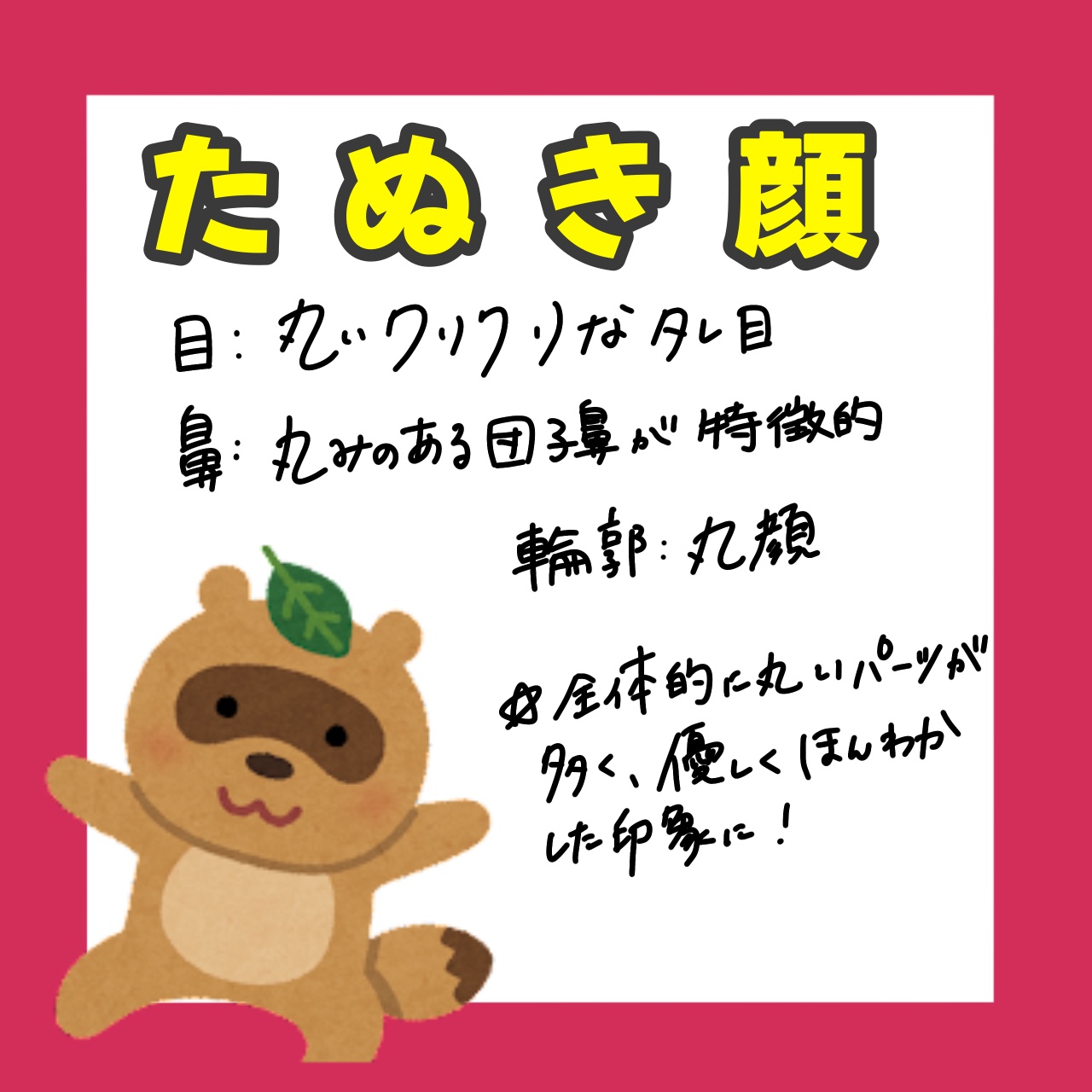 自分に似合うメイクが簡単にわかる! 1️⃣ たぬき顔さん 愛らしくて可愛いモテ顔代表 ・・・森香澄さん 2️⃣ うさぎ顔さん 幼くてあどけない、可憐な顔 ・・・ウォニョンさん 3️⃣ いぬ顔さん 万人に好かれる可愛くて優しい顔 ・・・石原さとみさん