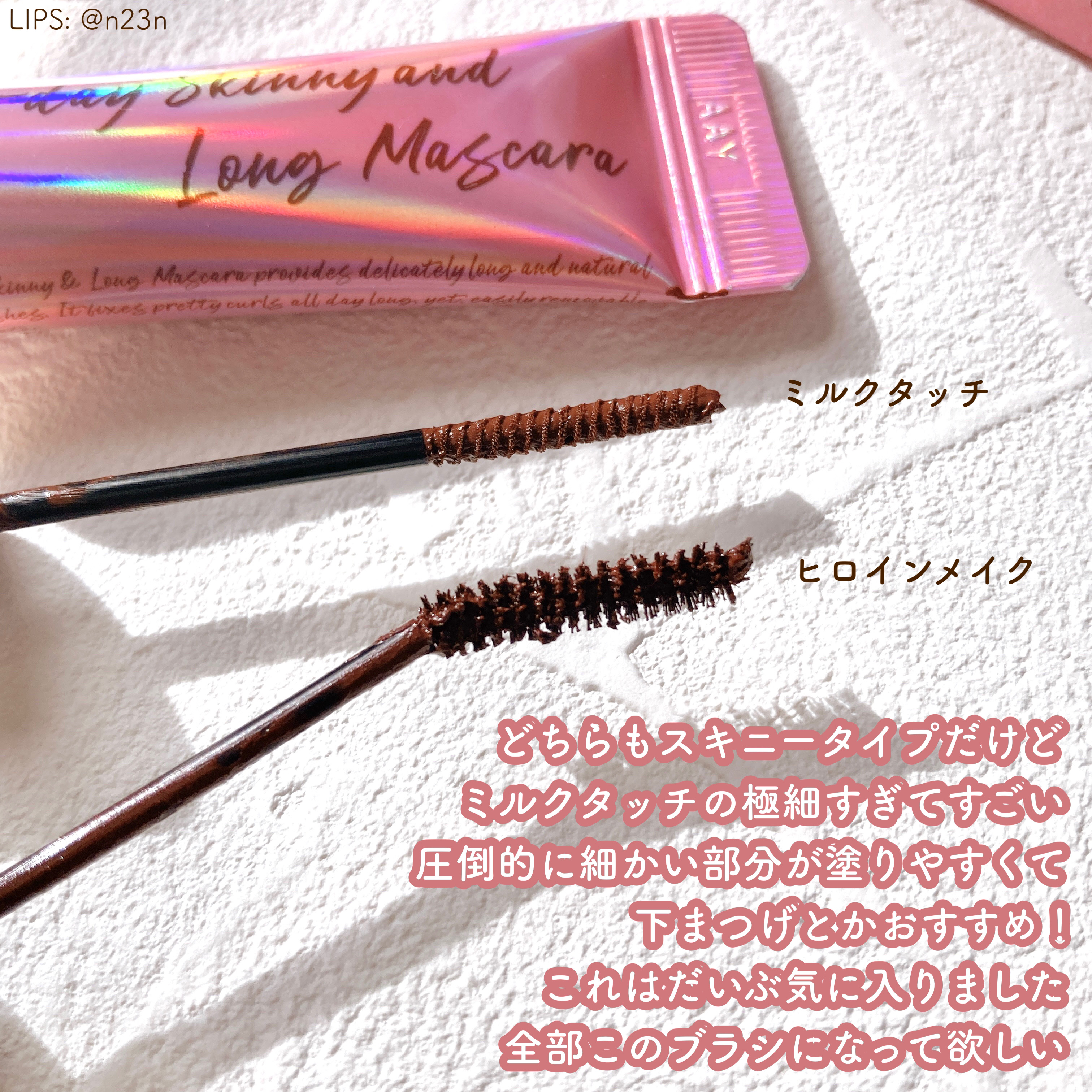 MilkTouchオールデイスキニーアンドロングマスカラブラウン¥1,408これを使うまで一時期ノーマスカラだったのに、一度使ったら毎日メイクに欠かせなくなりました!たまたま見つけたスキニータイプだったけど、細くて小さいから周りに付きにくくて...