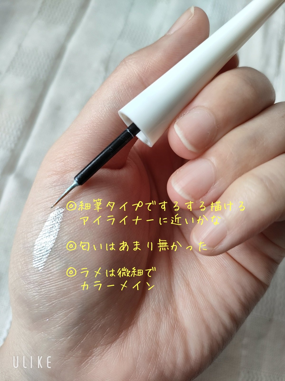 クレヨンタッチミー シャインジュエリーアイグリッター02ホワイトパールワッツで購入しました。(他の100均でも見かけましたよー)細筆タイプのグリッターです。筆にしっかり取れるタイプで使いやすいです。ラメの存在感があってキラキラ。ただ、乾くと輝...