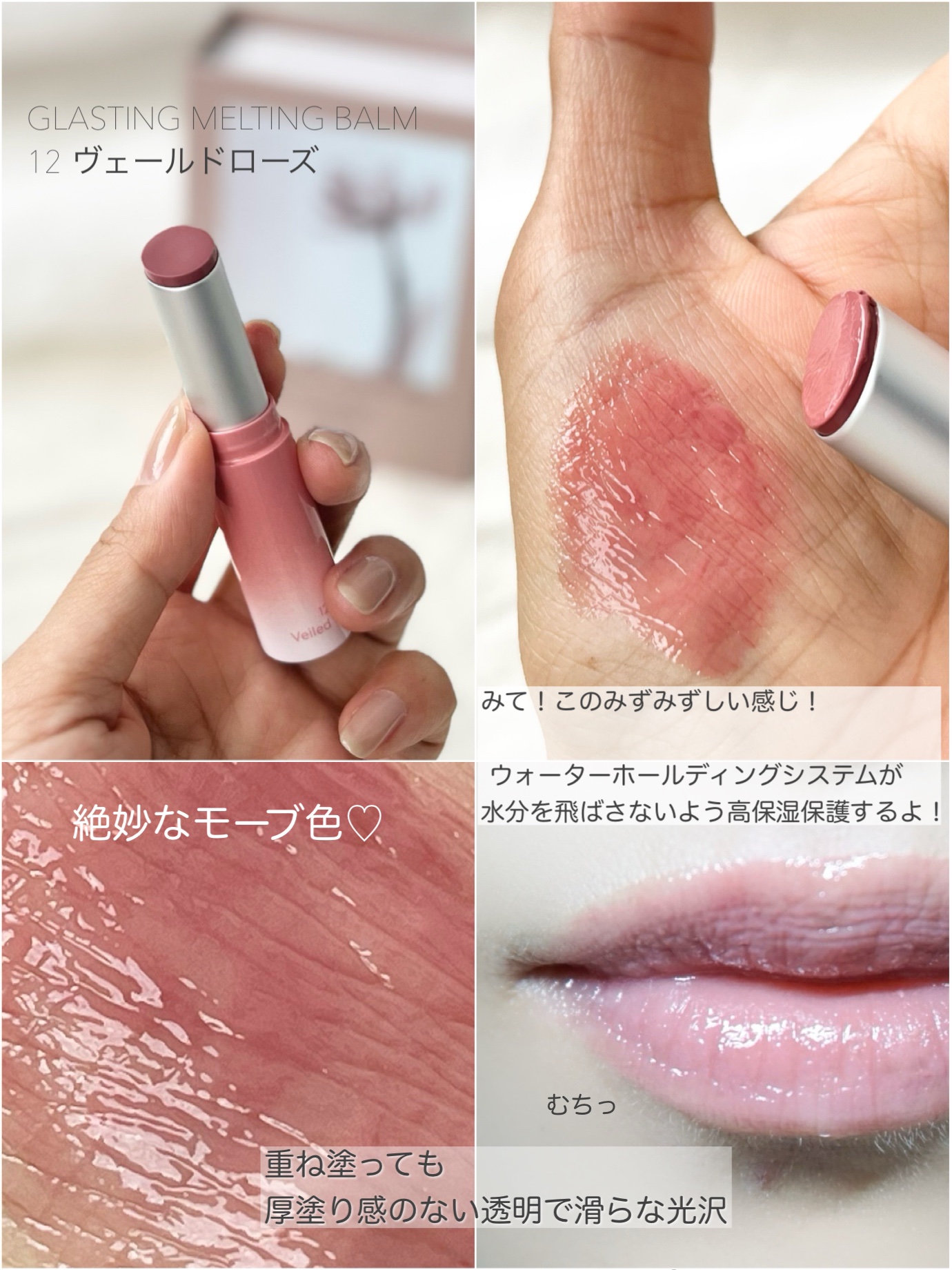 - もちっとした水膜で弾けそうなツヤリップ 1.軽い塗り心地のなめらかで透明な水爆弾ツヤ 2.塗った瞬間から唇を鮮やかに彩る多彩なカラーバーム 3.植物性保湿オイルでしっとりもっちり保湿バーム