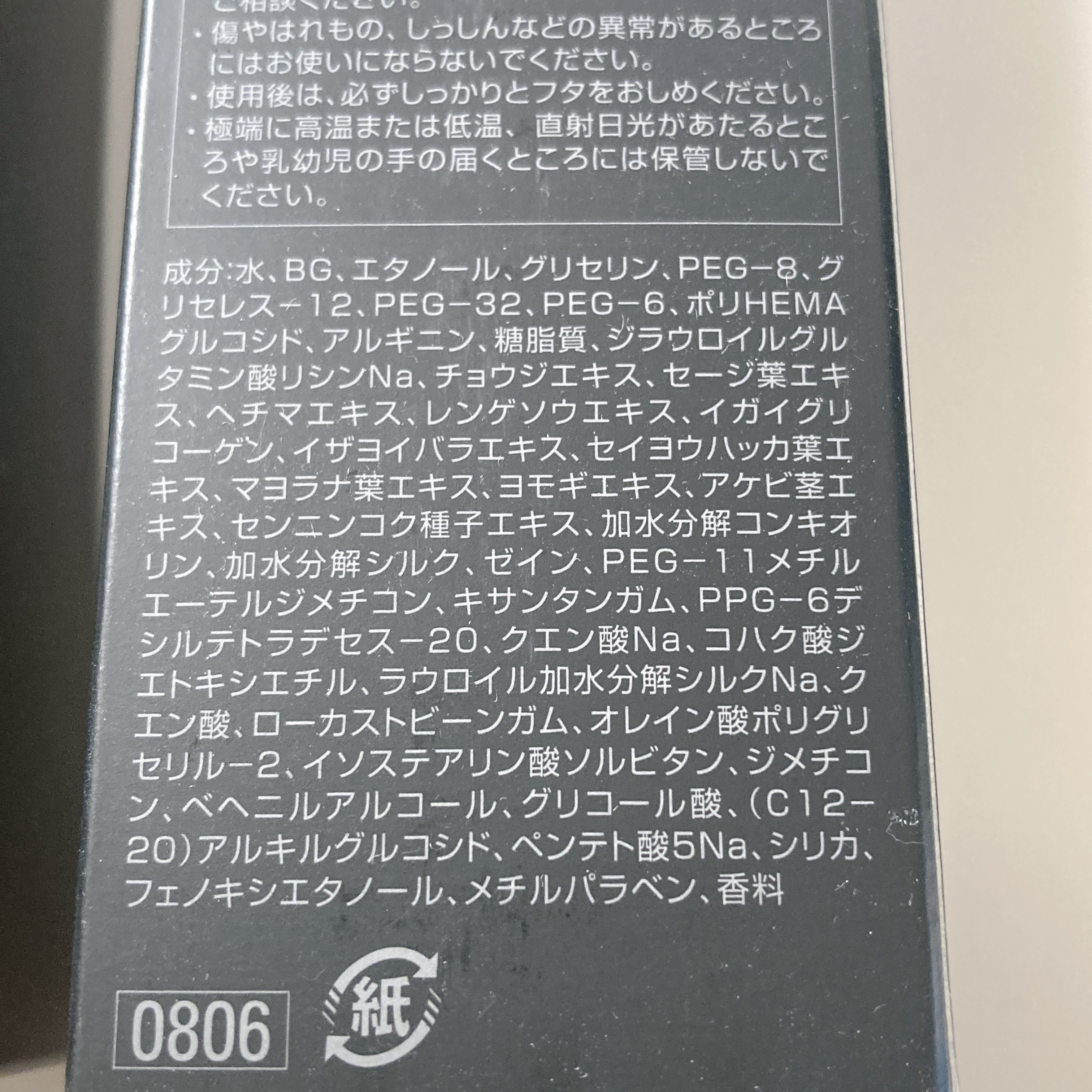 - <120ml> 水、BG、エタノール、グリセリン、PEG-8、グリセレス-12、PEG-32、PEG-6、ポリHEMAグルコシド、アルギニン、糖脂質、ジラウロイルグルタミン酸リシンNa、チョウジエキス、セージ葉エキス、ヘチマ果実/葉/茎エキス、レンゲソウエキス、イガイグリコーゲン、イザヨイバラエキス、セイヨウハッカ葉エキス、マヨラナ葉エキス、ヨモギ葉エキス、ミツバアケビ茎エキス、センニンコク種子エキス、加水分解コンキオリン、加水分解シルク、ゼイン、PEG-11メチルエーテルジメチコン、キサンタンガム、PPG-6デシルテトラデセス-20、クエン酸Na、コハク酸ジエトキシエチル、ラウロイル加水分解シルクNa、クエン酸、ローカストビーンガム、オレイン酸ポリグリセリル-2、イソステアリン酸ソルビタン、ジメチコン、ベヘニルアルコール、グリコール酸、(C12-20)アルキルグルコシド、ペンテト酸5Na、シリカ、フェノキシエタノール、メチルパラベン、香料 <リフィル(120ml)> 水、BG、エタノール、グリセリン、PEG-8、グリセレス-12、PEG-32、PEG-6、ポリHEMAグルコシド、アルギニン、糖脂質、ジラウロイルグルタミン酸リシンNa、チョウジエキス、セージ葉エキス、ヘチマ果実/葉/茎エキス、レンゲソウエキス、イガイグリコーゲン、イザヨイバラエキス、セイヨウハッカ葉エキス、マヨラナ葉エキス、ヨモギ葉エキス、ミツバアケビ茎エキス、センニンコク種子エキス、加水分解コンキオリン、加水分解シルク、ゼイン、PEG-11メチルエーテルジメチコン、キサンタンガム、PPG-6デシルテトラデセス-20、クエン酸Na、コハク酸ジエトキシエチル、ラウロイル加水分解シルクNa、クエン酸、ローカストビーンガム、オレイン酸ポリグリセリル-2、イソステアリン酸ソルビタン、ジメチコン、ベヘニルアルコール、グリコール酸、(C12-20)アルキルグルコシド、ペンテト酸5Na、シリカ、フェノキシエタノール、メチルパラベン、香料 <ハーフサイズ(60ml)> 水、BG、エタノール、グリセリン、PEG-8、グリセレス-12、PEG-32、PEG-6、ポリHEMAグルコシド、アルギニン、糖脂質、ジラウロイルグルタミン酸リシンNa、チョウジエキス、セージ葉エキス、ヘチマ果実/葉/茎エキス、レンゲソウエキス、イガイグリコーゲン、イザヨイバラエキス、セイヨウハッカ葉エキス、マヨラナ葉エキス、ヨモギ葉エキス、ミツバアケビ茎エキス、センニンコク種子エキス、加水分解コンキオリン、加水分解シルク、ゼイン、PEG-11メチルエーテルジメチコン、キサンタンガム、PPG-6デシルテトラデセス-20、クエン酸Na、コハク酸ジエトキシエチル、ラウロイル加水分解シルクNa、クエン酸、ローカストビーンガム、オレイン酸ポリグリセリル-2、イソステアリン酸ソルビタン、ジメチコン、ベヘニルアルコール、グリコール酸、(C12-20)アルキルグルコシド、ペンテト酸5Na、シリカ、フェノキシエタノール、メチルパラベン、香料