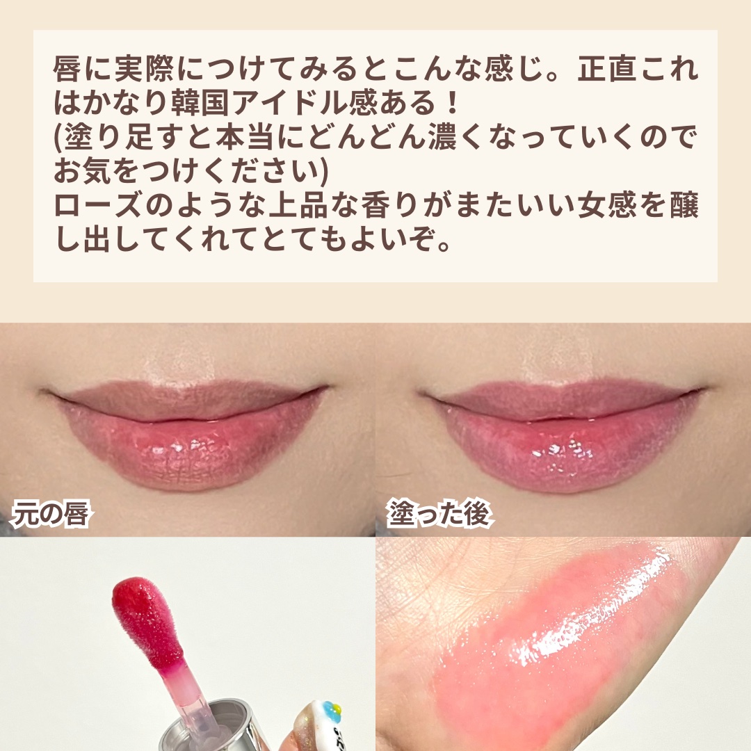| 重すぎないほんのりとろっとしたテクスチャーのリップオイルです。 唇に乗せるとちゅるちゅるで可愛い! | 詳細を見る | ||