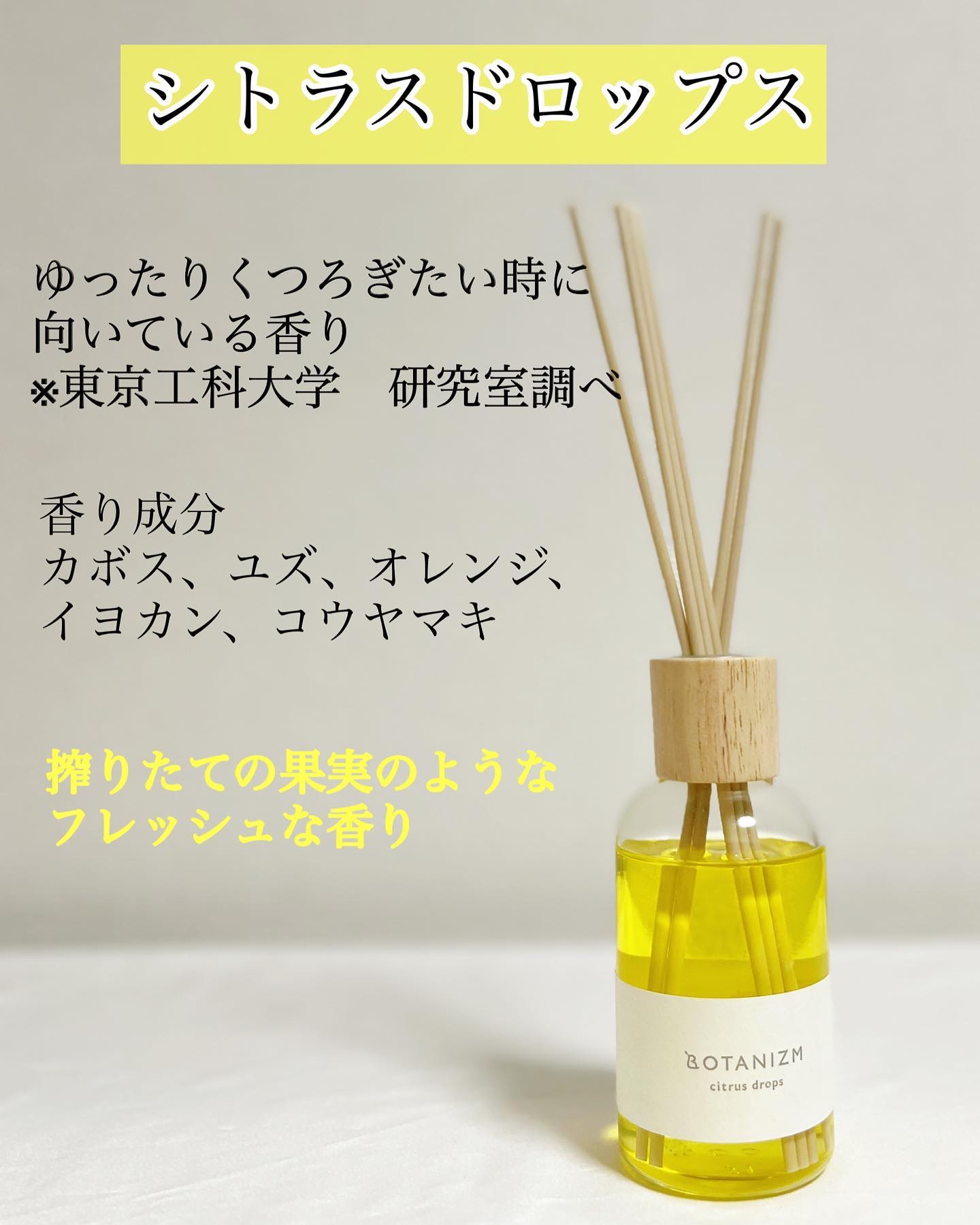 『リードディフューザー ハーバルブリーズ』 ベルガモットなど柑橘系の香りに加えてローズゼラニウムやダマスクバラなどのリッチな花の匂いがする! 天然精油100%の香りで、ナチュラルな感じもめっちゃいい◯ 『リードディフューザー シトラスドロップス』 シトラスベースの香りで、丸みを帯びた柔らかい匂いが特徴! リラックスタイムやぼーっとしたい時などに良さそうな香りです!