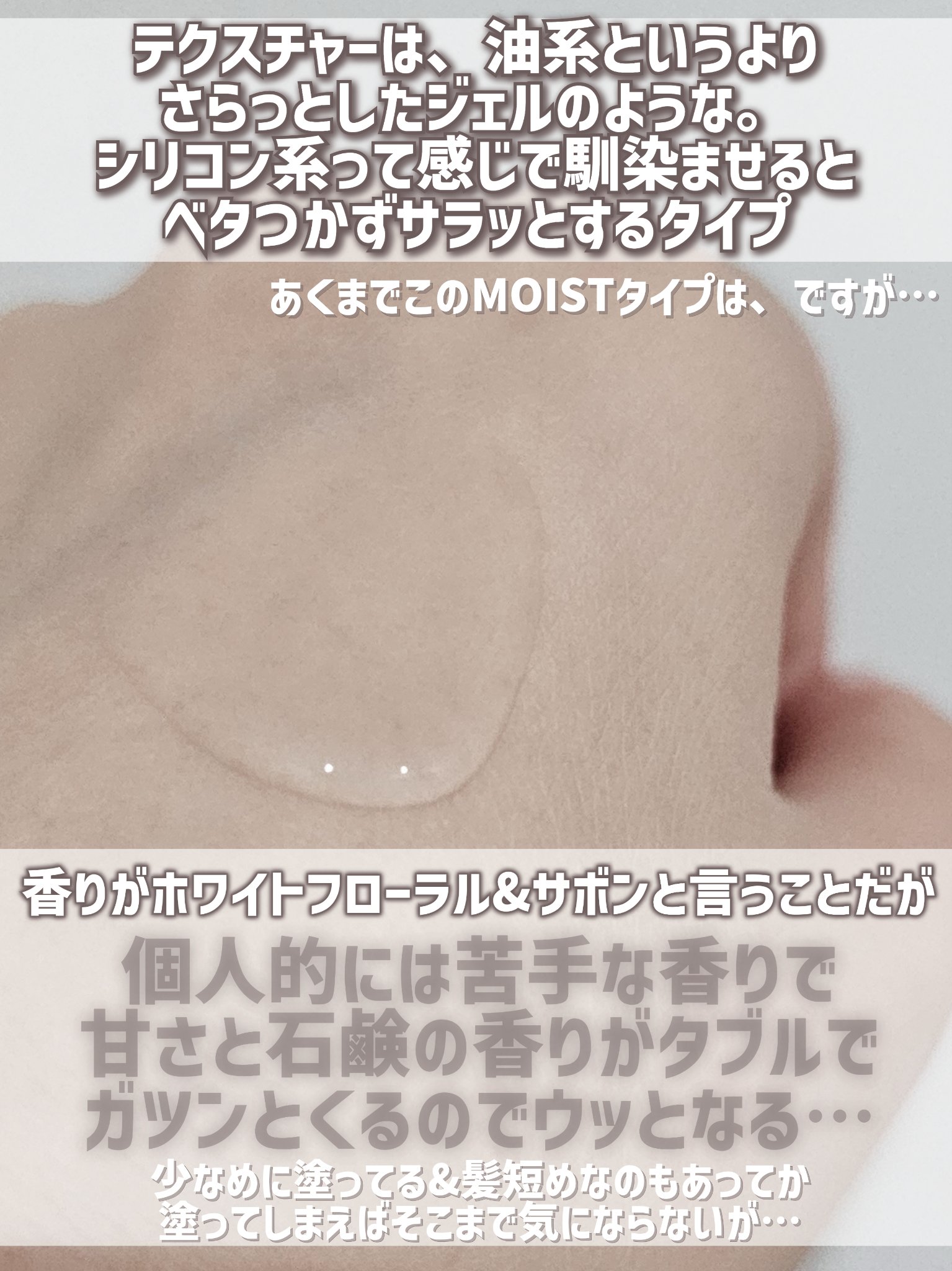 シルキー、モイスト、ソフトウェット、ウェットの4種類展開のヘアオイル🫧 保湿成分としてホホバオイルなどが配合されています✨ 程よくまとまりもいい3番がお気に入りです🥰