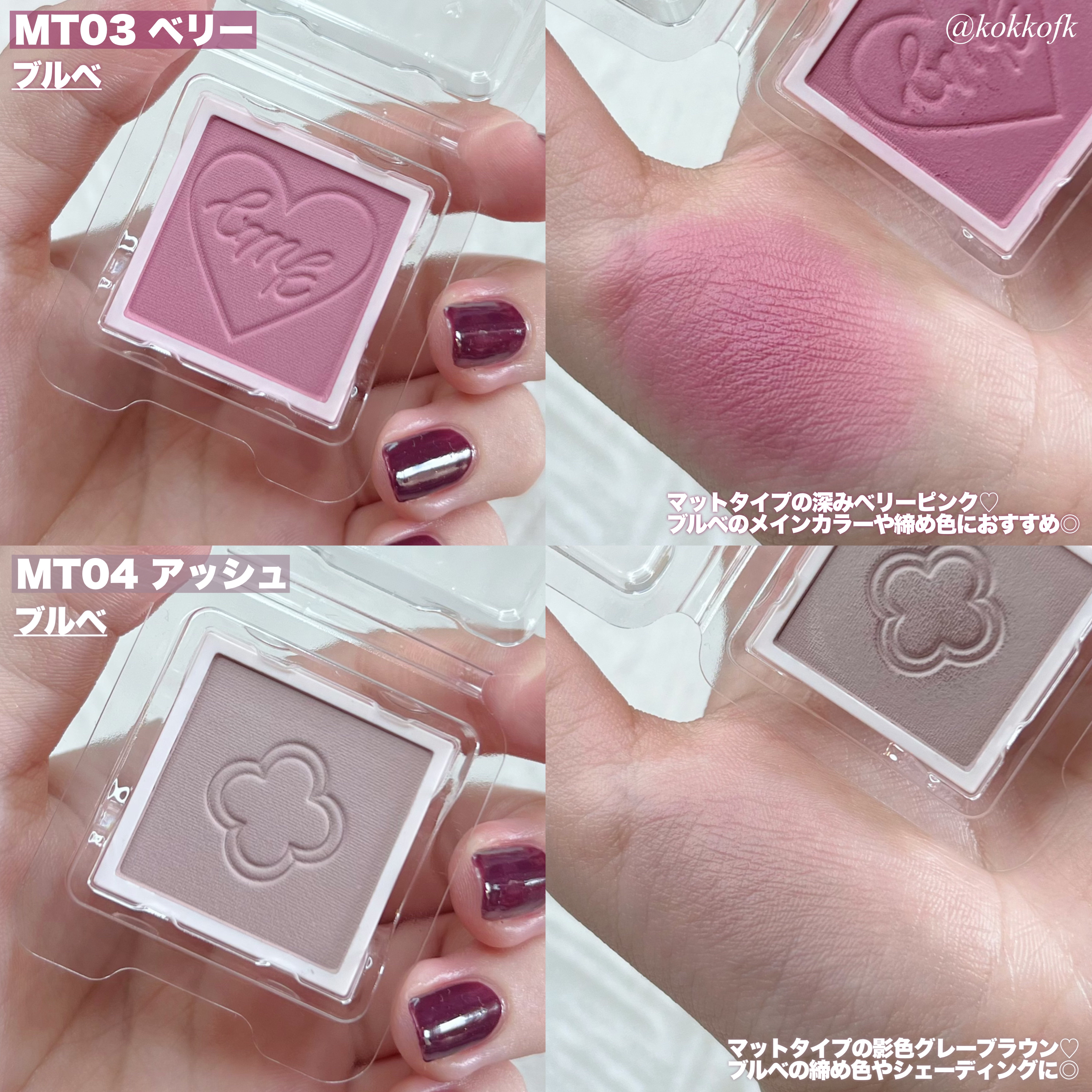 薄く唇に密着する新作マットティント。 マットなのにかなりしっとりとしていて 乾燥を感じなくてびっくりでした! 一気にこなれ感が出るトレンドカラーです♡ やや青みの華やかローズレッド 公式画像より鮮やかめに感じました。 やや黄みの強くて深いオレンジレッド ストロングオータムに超激推しです! やや黄みの非常に深く濃いダークブラウン ディープオータムに激推しです! かわいい雰囲気になれるピンクリップです♡ やや青みの柔らかいくすみピンクベージュ ミューテッドサマーにおすすめです! 青みの落ち着いたローズピンク やや青みのとても鮮やかなビビッドレッド ビビッドウィンターに特におすすめ! 既存マットティントよりもさらに ふわふわなマット感が魅力のリップで、 軽くティッシュオフしてもほとんど落ちない◎ マスクにも激推しのティントなので、 ぜひ皆さんもチェックしてみてね❤︎