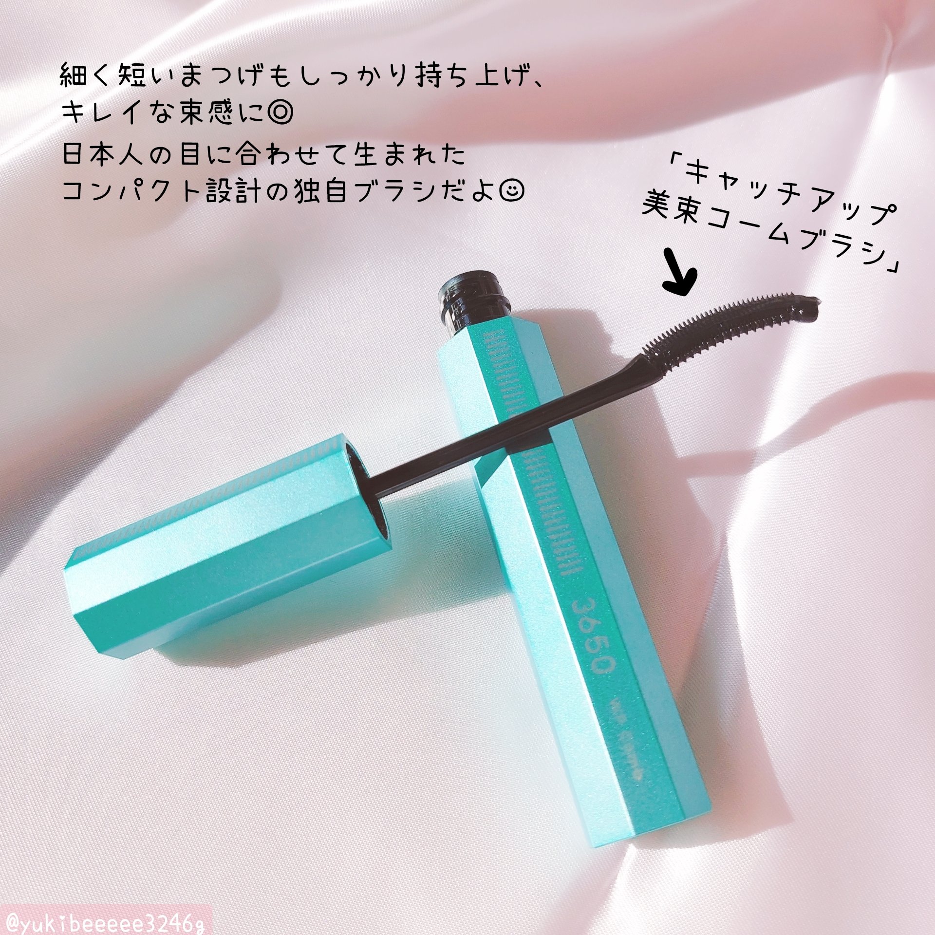 - ひと塗りで美束、繊細コーム。 ひと塗りで放射状の美束感に。毛先シャープに仕上がるコームタイプ。透明感あるクリアブラック。 【上向き続く、ウォータープルーフタイプ】 まつげの根元からカールアップして長時間キープするウォータープルーフタイプ。上向きカール持続。 【キャッチアップ美束コームブラシ】 細く短いまつげもしっかり持ち上げ、キレイな束感に。 日本人の目に合わせて生まれたコンパクト設計の独自ブラシ。 【涙・汗・皮脂・こすれに強く、にじみにくいスマッジプルーフ処方】 落とす時は、3650マスカラリムーバー、または油性クレンジング料をお使いください。 【まつげ美容液成分配合メイクしながら美まつげへ】 マスカラを塗るたびまつげケア。 オタネニンジン根エキス・ツバキ種子油・ビワ葉エキス・パールエキス*1全て(保湿剤) 【抗菌*2ボトル採用】 【アレルギーテスト済み】 全ての人にアレルギーが起こらないわけではありません。 【シリコンフリー アルコールフリー】 *1 加水分解コンキオリン *2 全ての菌に有効ではありません。
