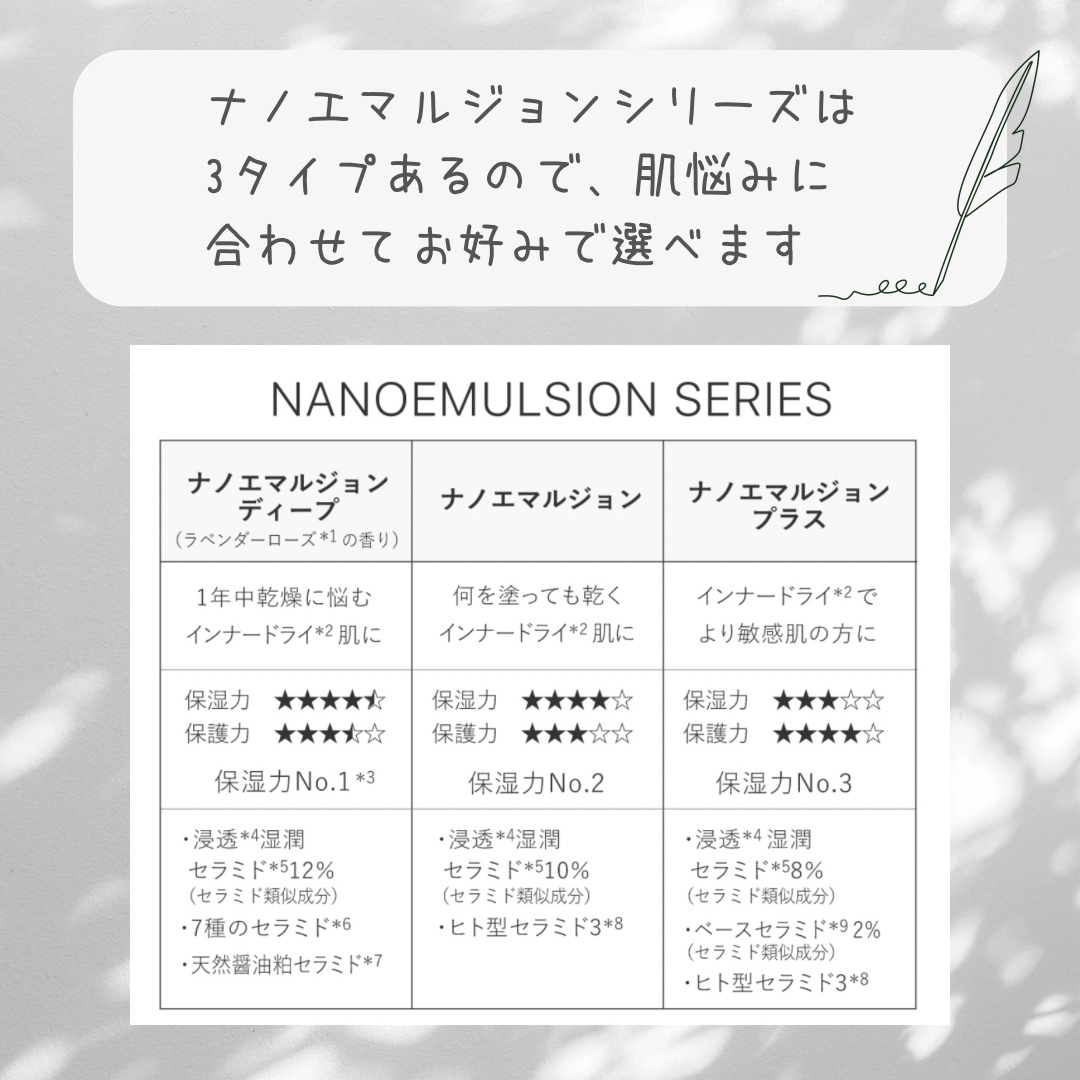 - 一年中乾燥に悩むインナードライ*2肌にはナノエマルジョン ディープ <セラミド類似成分*3 12%+5種のヒト型セラミド*4> セラミドをリン脂質で包み、粒子径を細かくした多重膜構造ナノカプセルで肌なじみの良い青白い外観が特徴です。 さらに、保水力に優れたエクトイン*5を0.5%高配合しました。 ラベンダーローズの香り*6。 *2 角層内の乾燥 *3 ラウロイルグルタミン酸ジ(フィトステリル/オクチルドデシル)、セチルPGヒドロキシエチルパルミタミド、ラウロイルグルタミン酸ジ(オクチルドデシル/フィトステリル/ベヘニル)(保護) *4 セラミドEOP、セラミドNG、セラミドNP、セラミドAG、セラミドAP(保護) *5 整肌 *6 ラベンダー油、ダマスクバラ花油、ニオイテンジクアオイ油