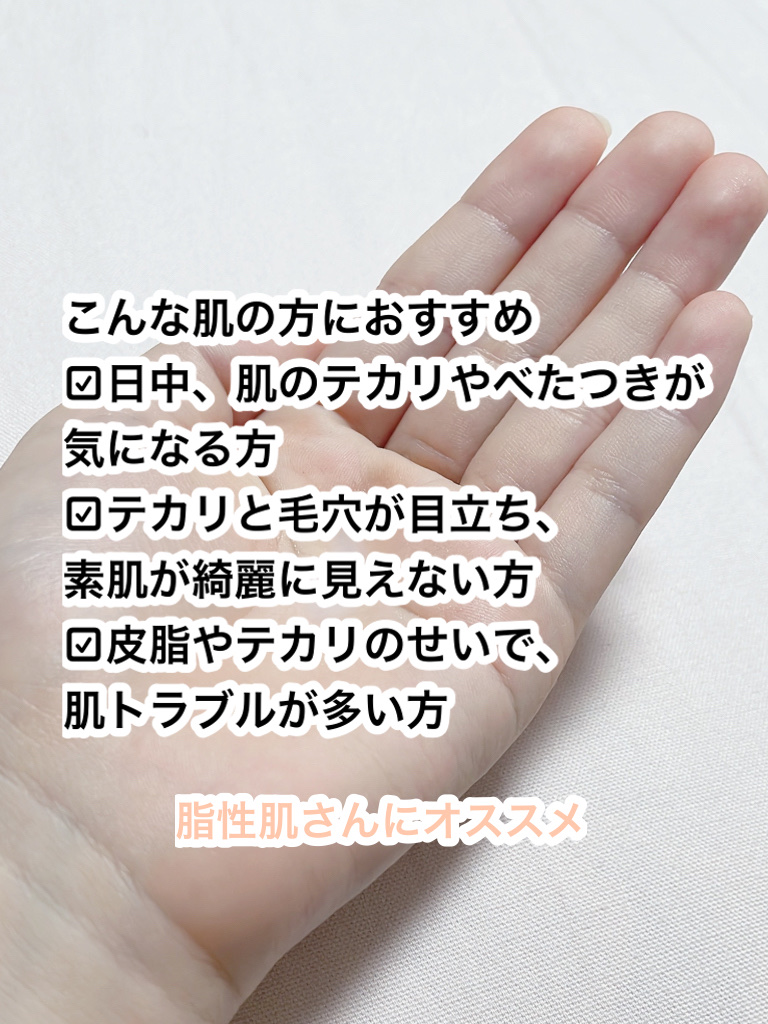化粧のノリが良くなる ナチュラルにトーンアップされる テカリ、ベタつきがなくなる のびが良い ベタつかない 崩れにくい コスパが良い カバー力があまりない 時間が経つと白浮する