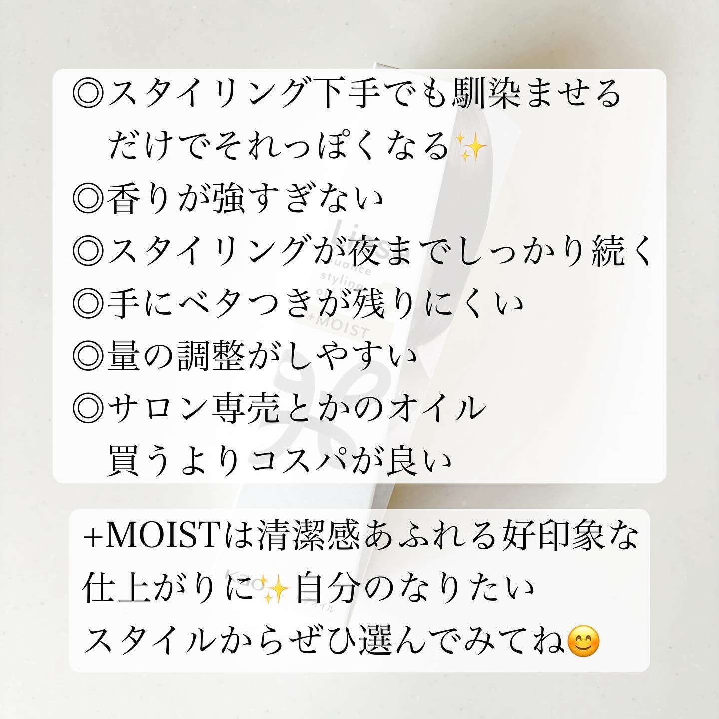 前にヘアオイルのPRで調べて知ったんやけど スタイリングオイルとケア用のオイルってそもそも用途が違うので 今までケア用のオイルをスタイリングに使ってた私は 「時間経ったらただのサラサラヘアや( ◠‿◠ )」って思ってた…笑 こちらは試してみると、スタイリングオイルなので 夕方まで朝にセットした質感が保たれてた✨ 香りも、まさに美容室帰りみたいな香り ちょっと焦げっぽい、あの香り。笑 4種類の仕上がりから選べて、 今回は+MOISTを使ったけど 表面がまとまってウエット感はない、 しっとり清潔感のある仕上がりになった👏💕 1プッシュが少量ずつ出てくるので ショートの私は4プッシュでいい感じに 後でちょっと足そうかな?って時も 少量ずつ出るのが使いやすかったよ😊 こちらは税込1,540円でお財布に優しい👛 スタイリングオイルを探してる方は ぜひチェックしてみてね🙆♀️
